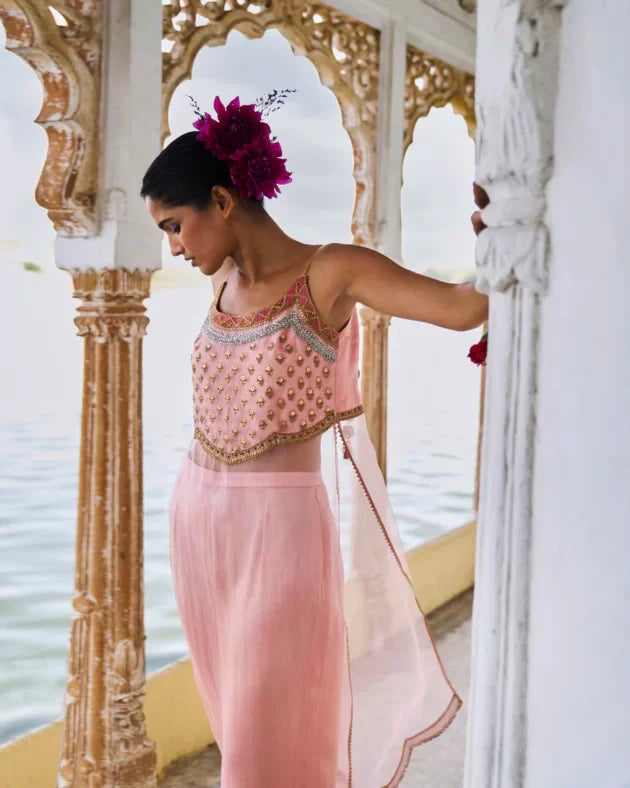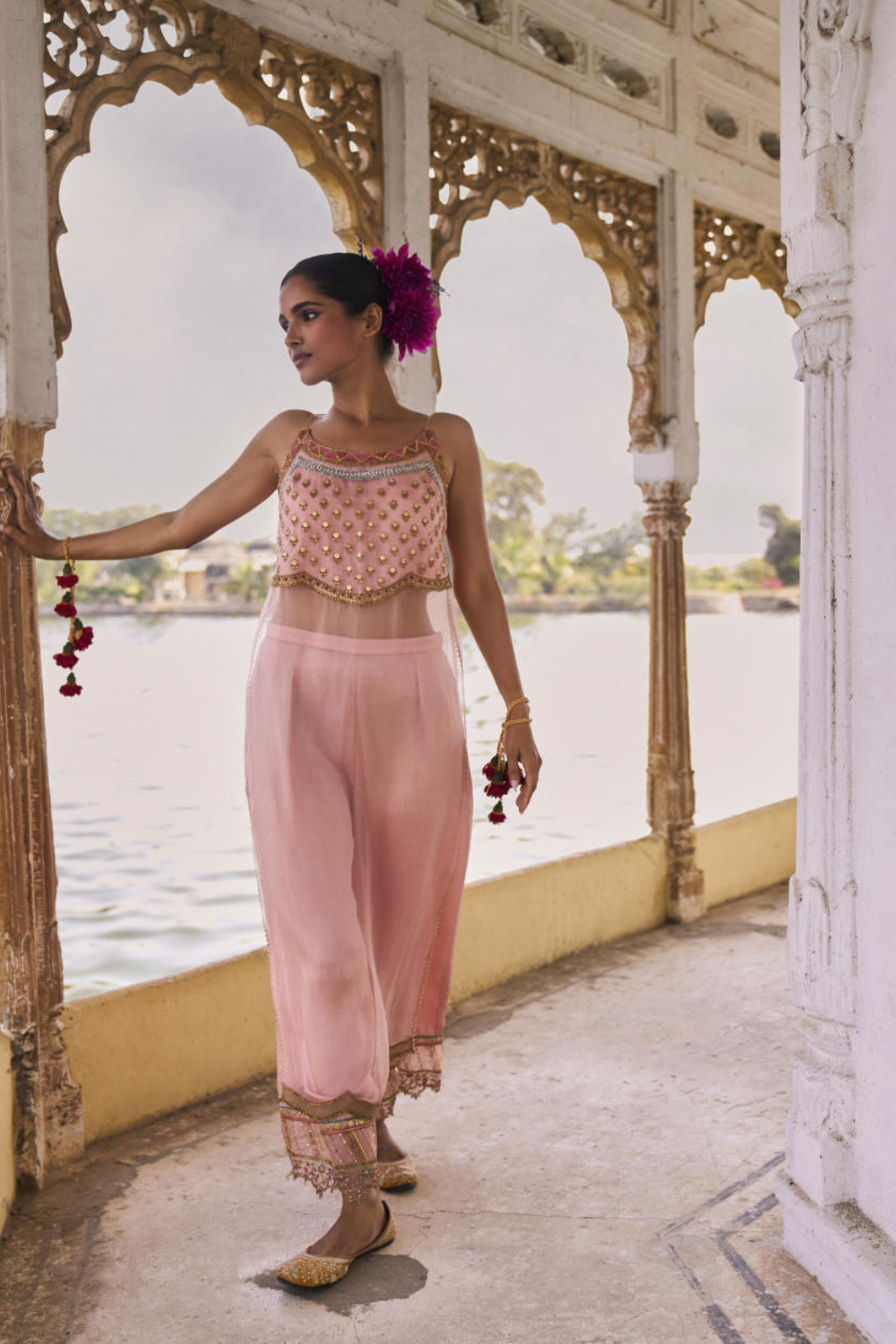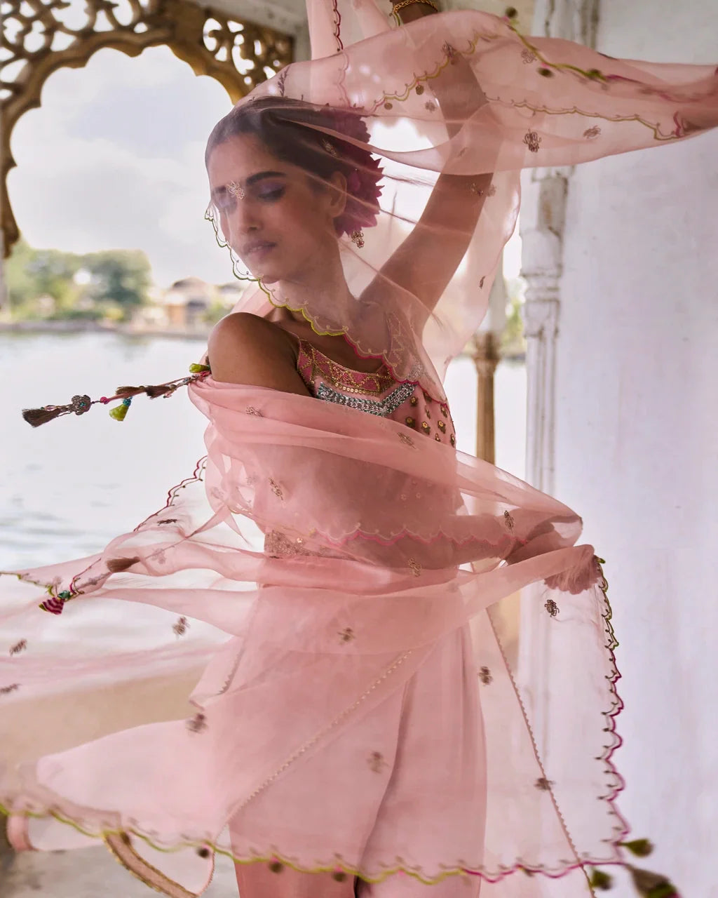 Nude pink organza kurta with hand embroidery on yoke and scalloped hemline paired with nude modal satin palazzo with hand embroidered organza panel and dori embroidered nude pink organza dupatta with scallopsand tassel detailing.