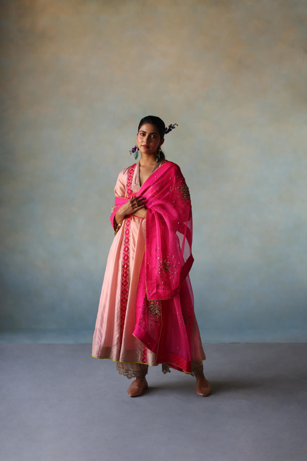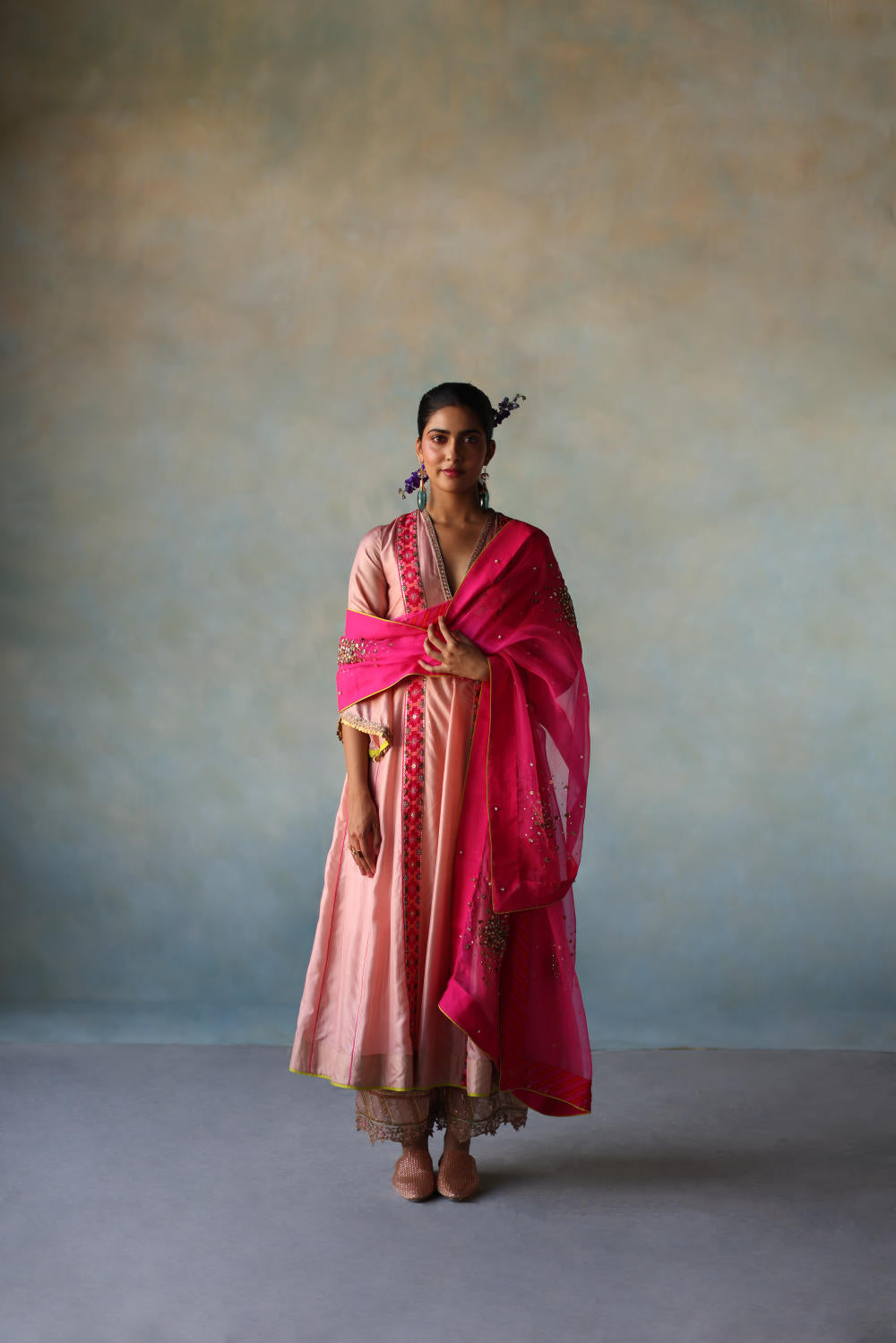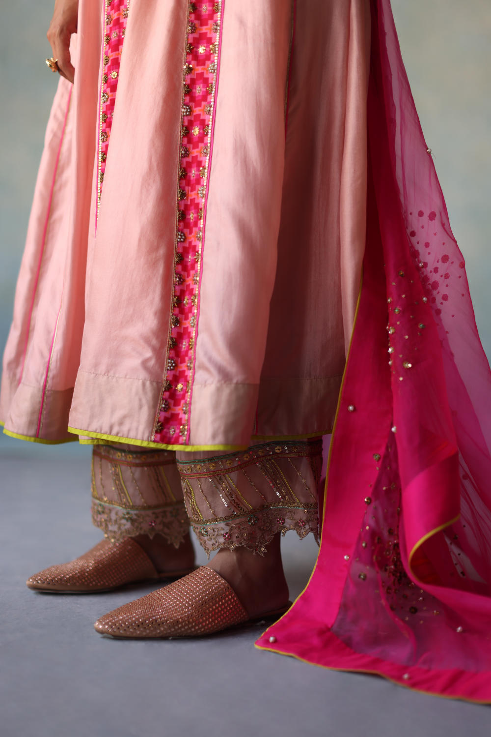Nude Pink side kali kurta with hand embroidered neckline , sleeves and panel pattis paired with hand embroidered palazzo. Along with hot pink organza sequin hand embroidered dupatta with silk back finish.