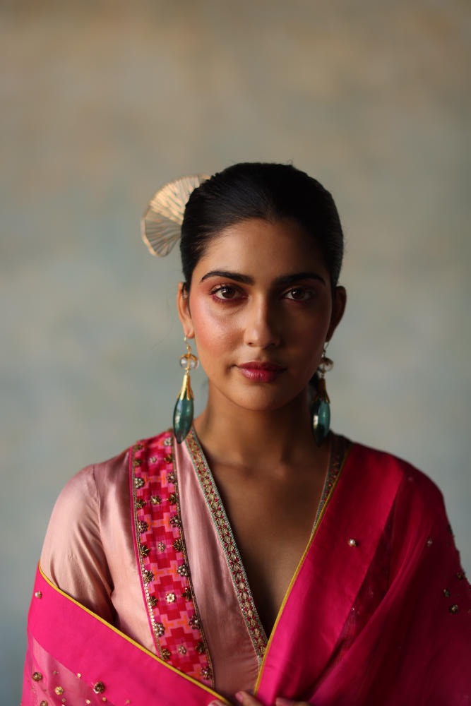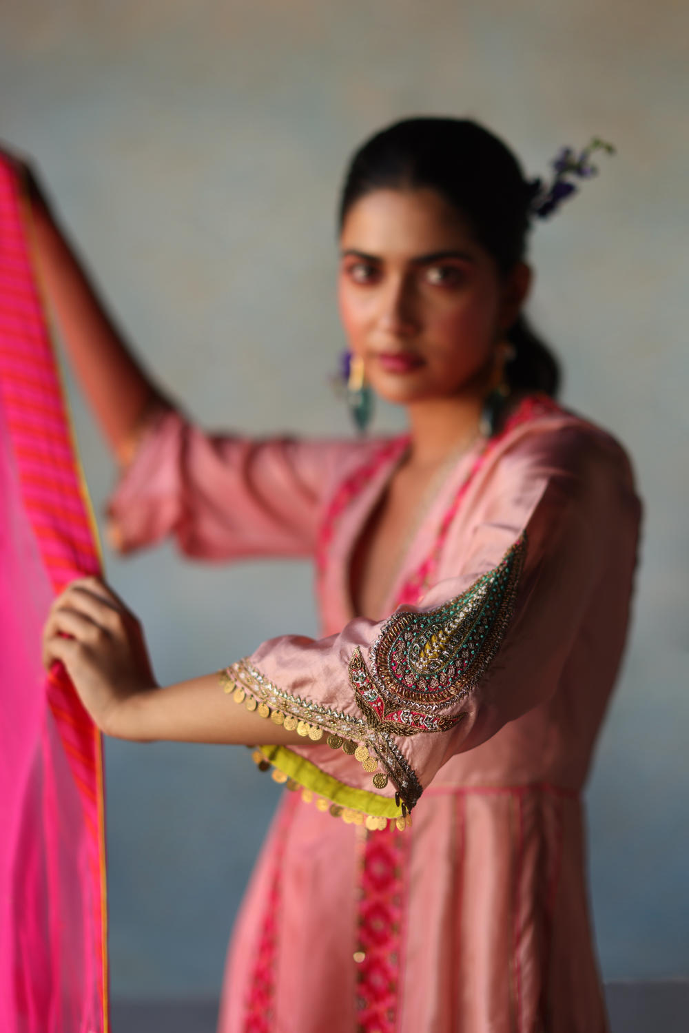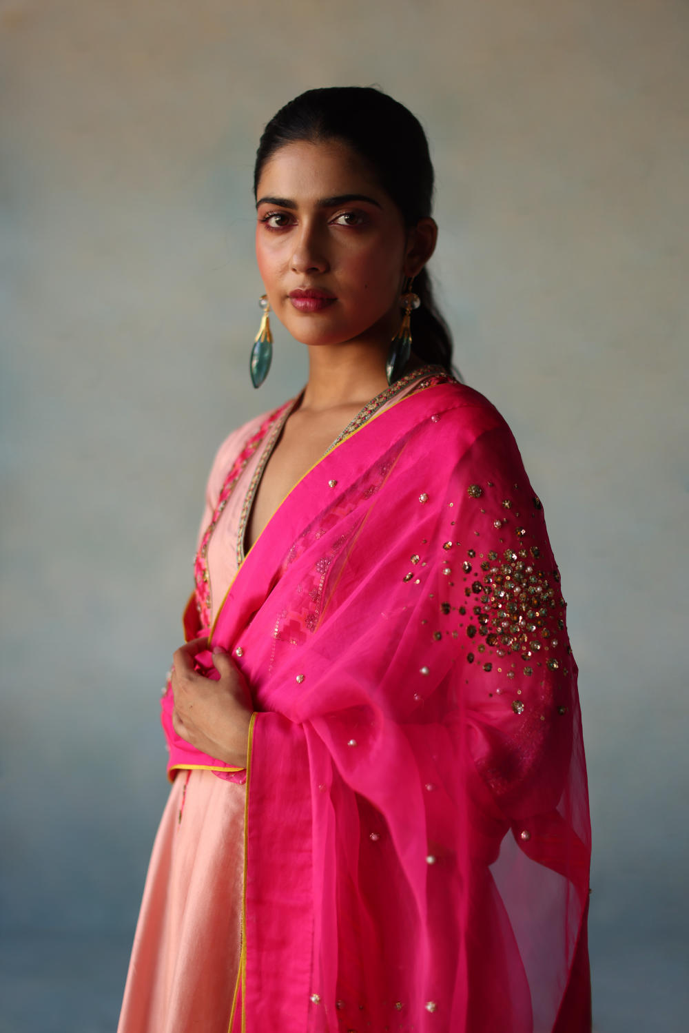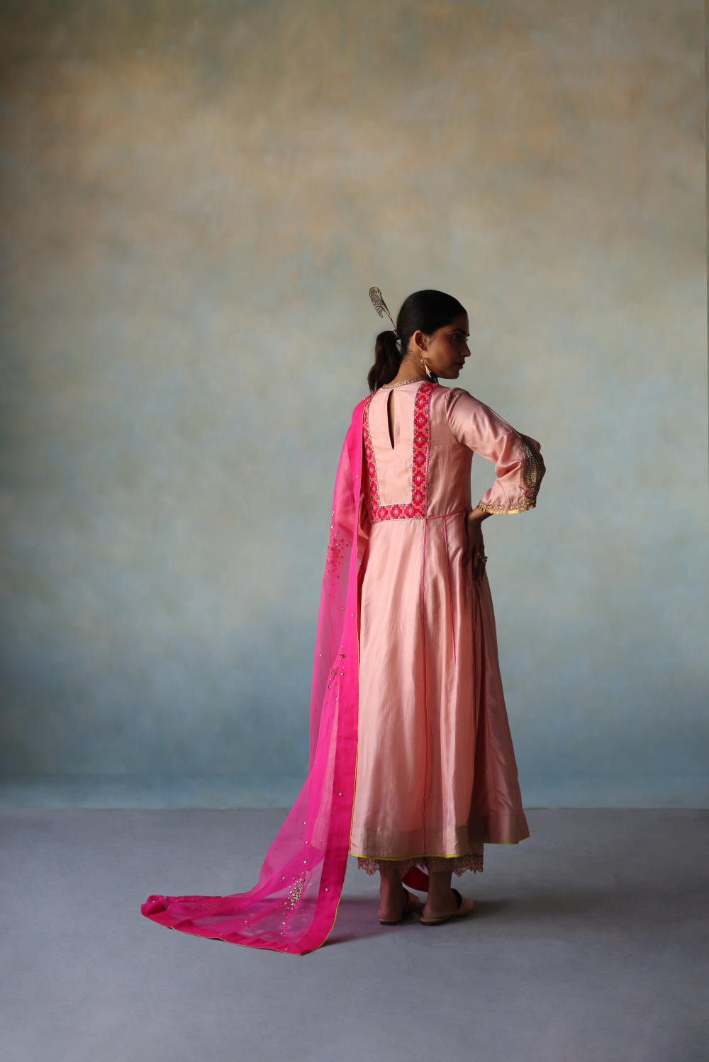 Nude Pink side kali kurta with hand embroidered neckline , sleeves and panel pattis paired with hand embroidered palazzo. Along with hot pink organza sequin hand embroidered dupatta with silk back finish.