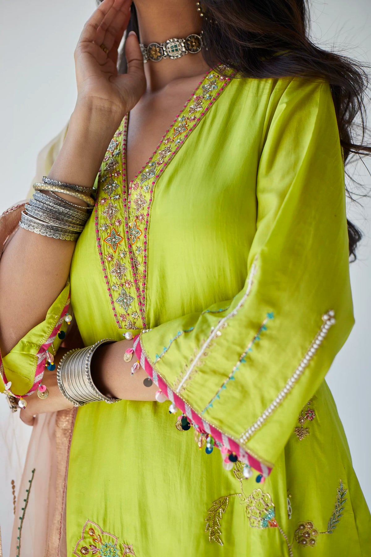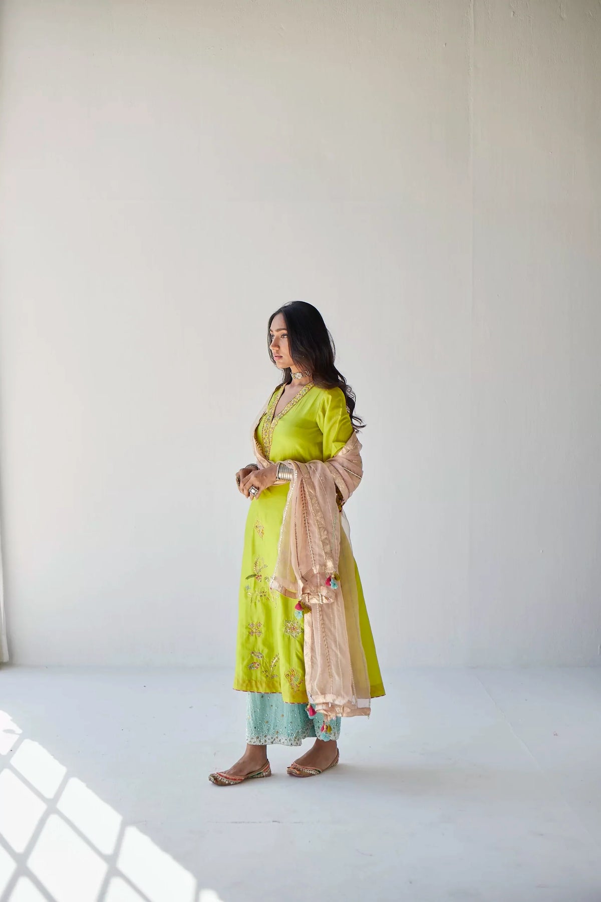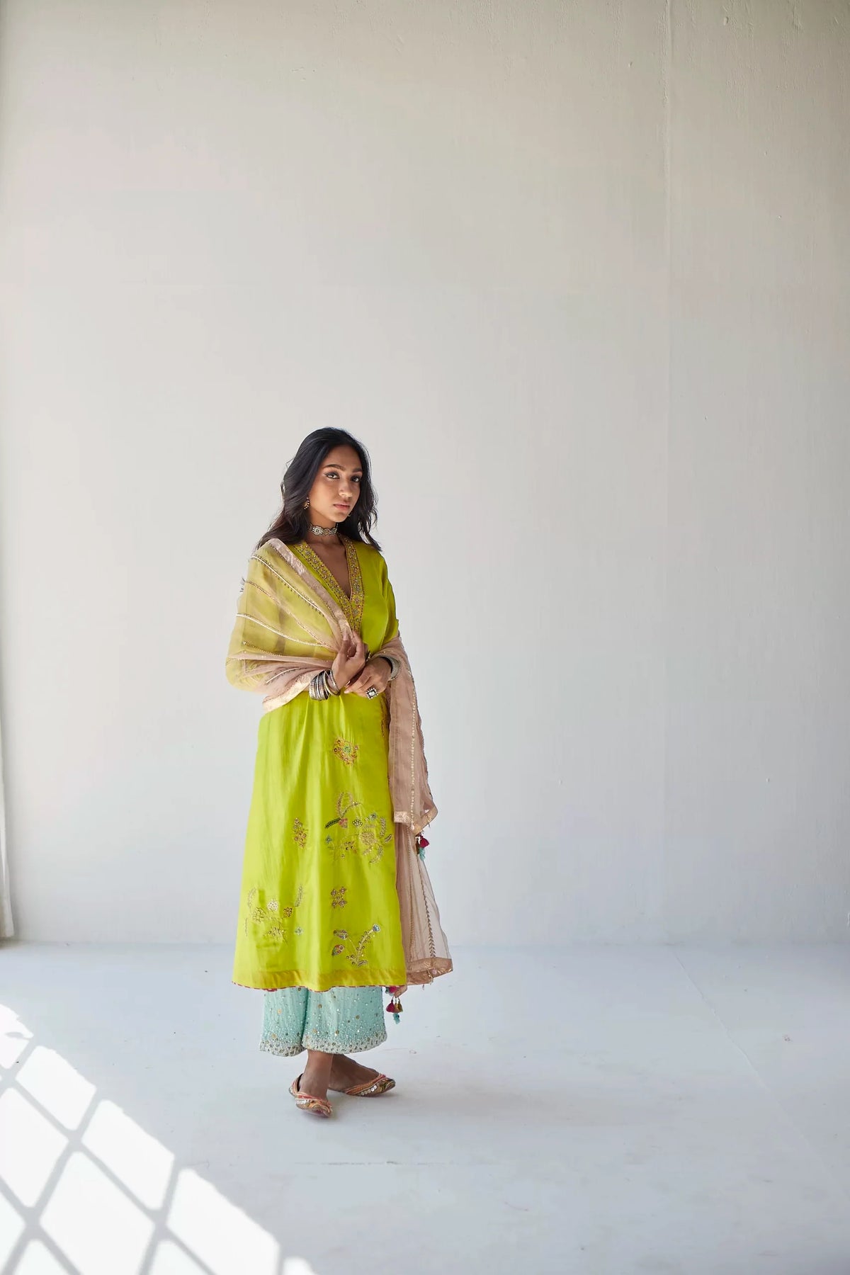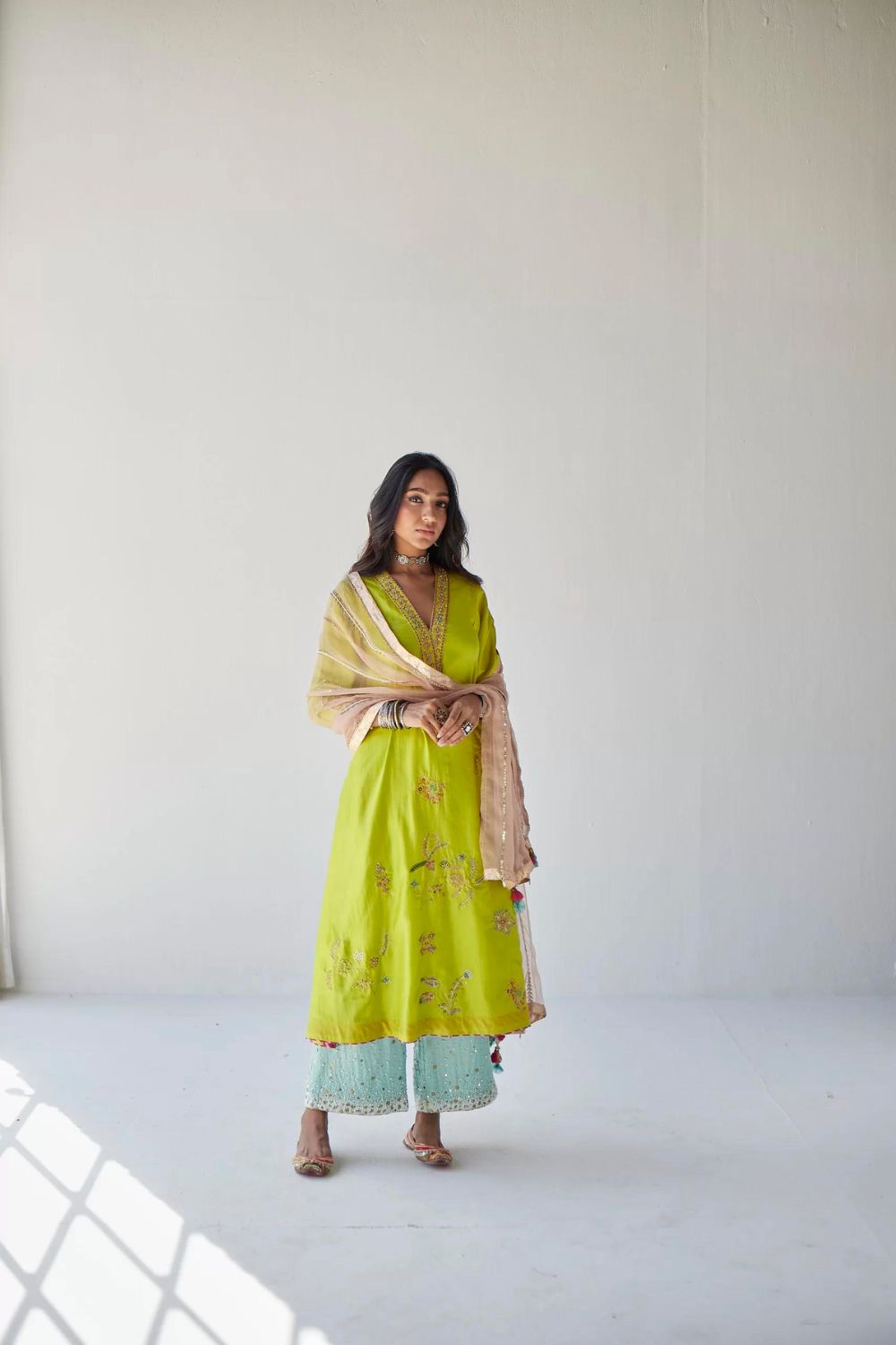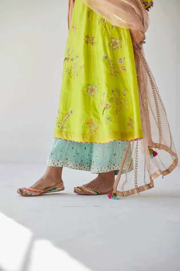 Lime Green silk A- line kurta with intricate hand embroidery paired with embroidered dreamy blue palazzo . Along with nude pink hand embroidered organza dupatta .