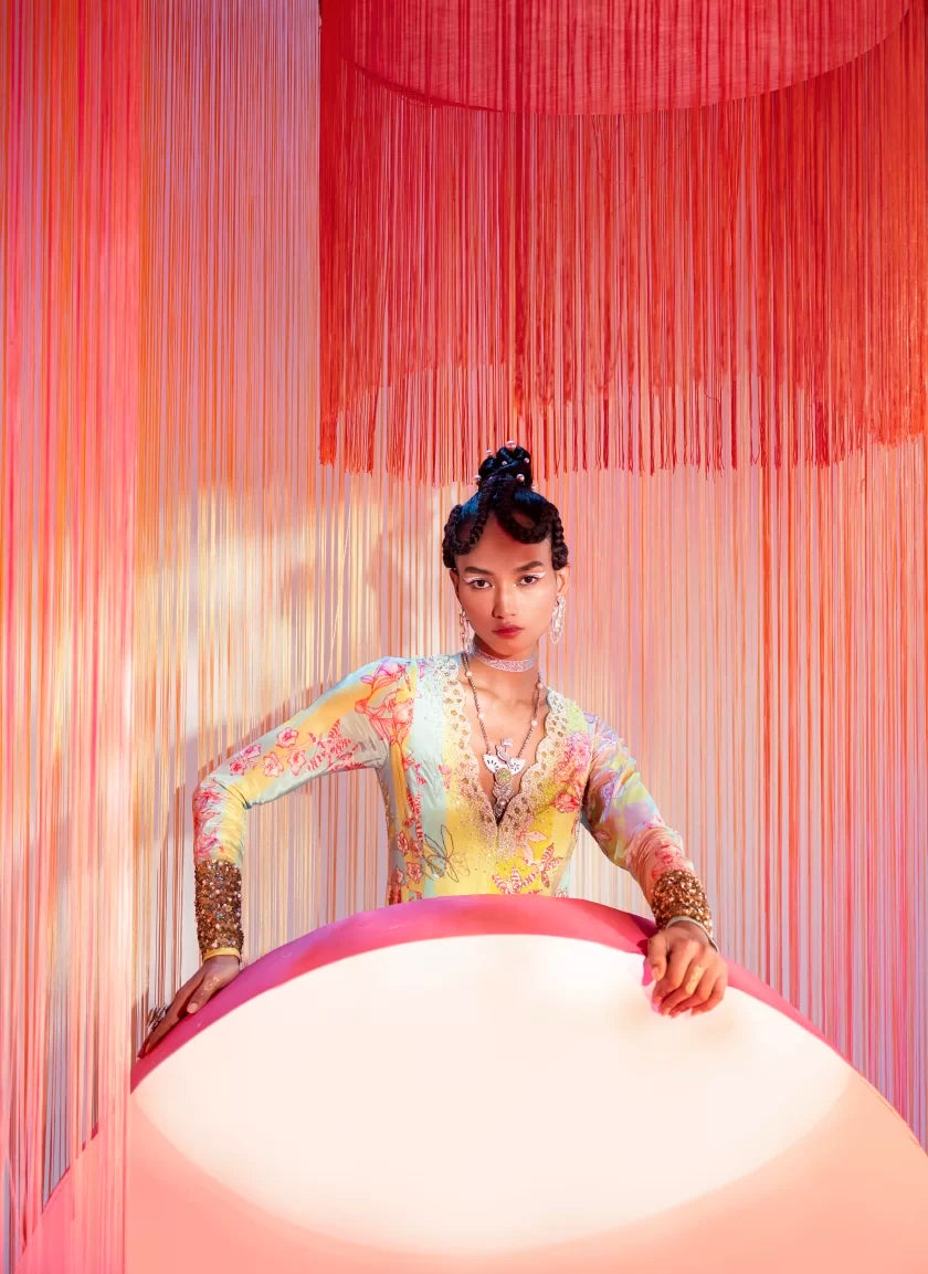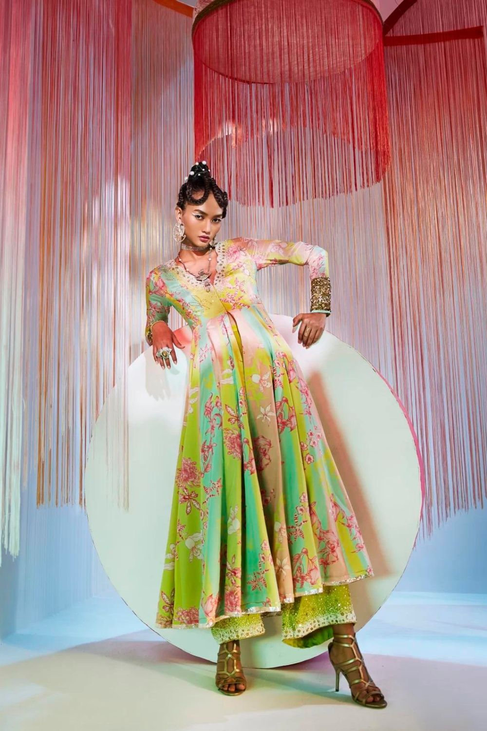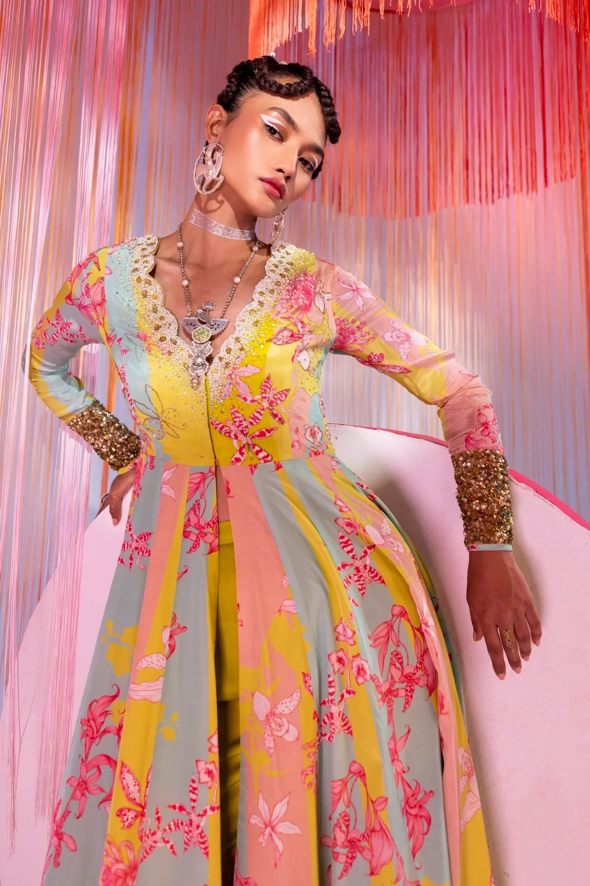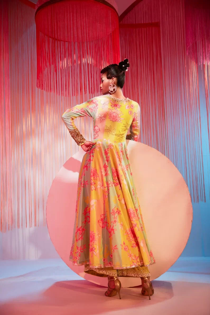 Lime Yellow – Powder Pink printed crepe front slit anarkali with intricate hand embroidered scalloped neck and sleeves .Along with bright lime pearl hand embroidered palazzo.