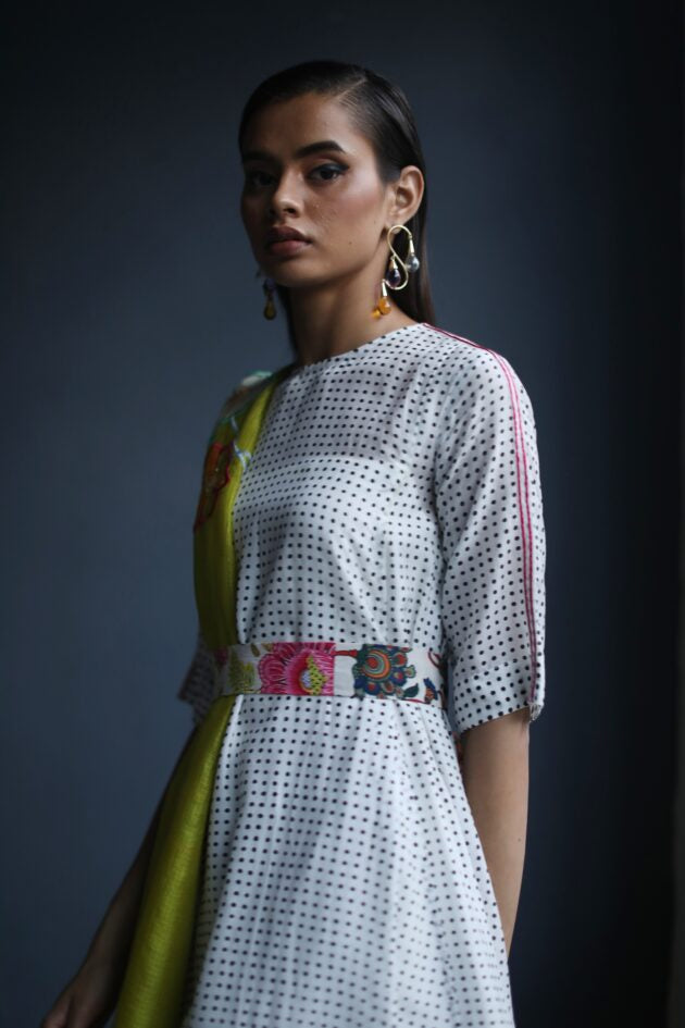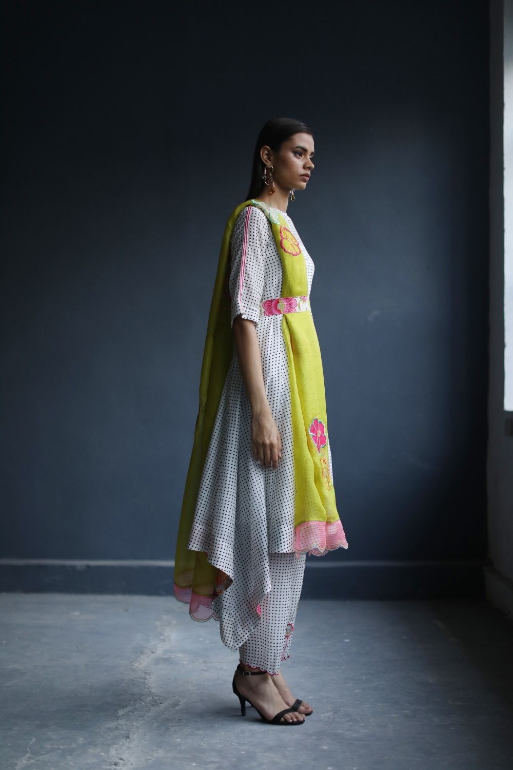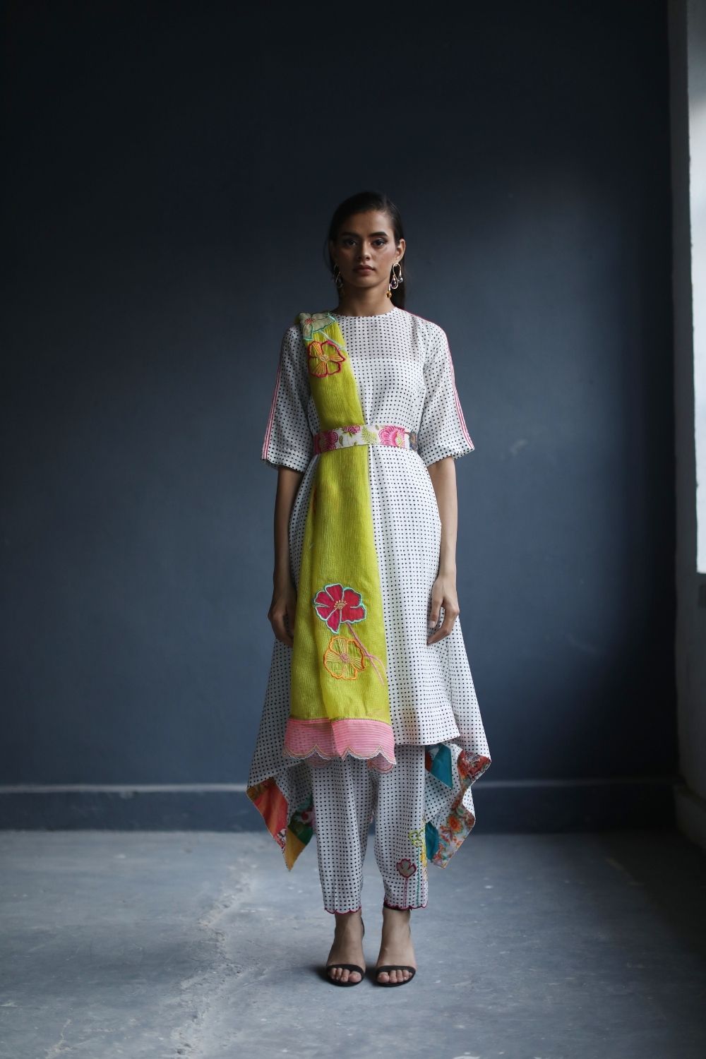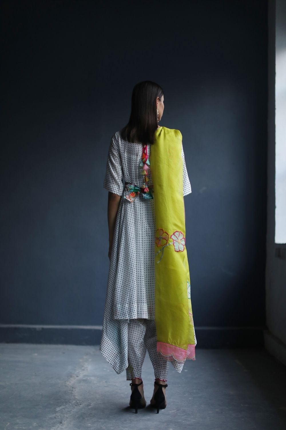 A Printed cotton Asymmetrical Kurta with tassel detailing at back paired with Embroidered Printed Salwar and Yellow Kota silk Dupatta with Applique work and organza scalloped sides.