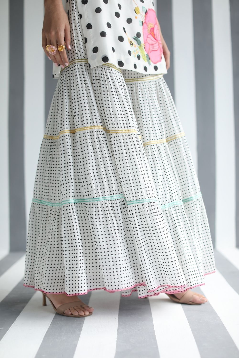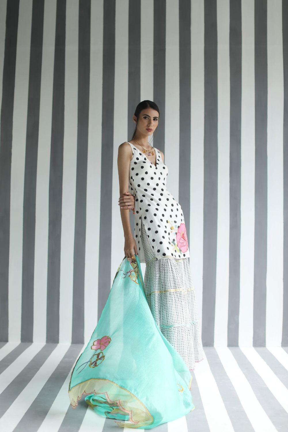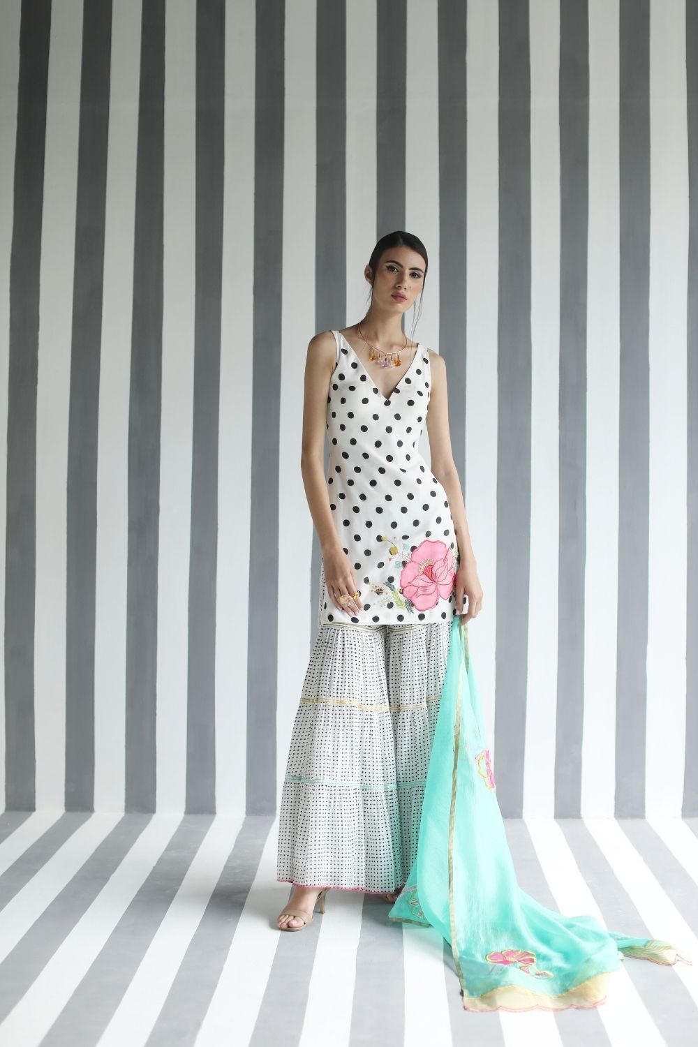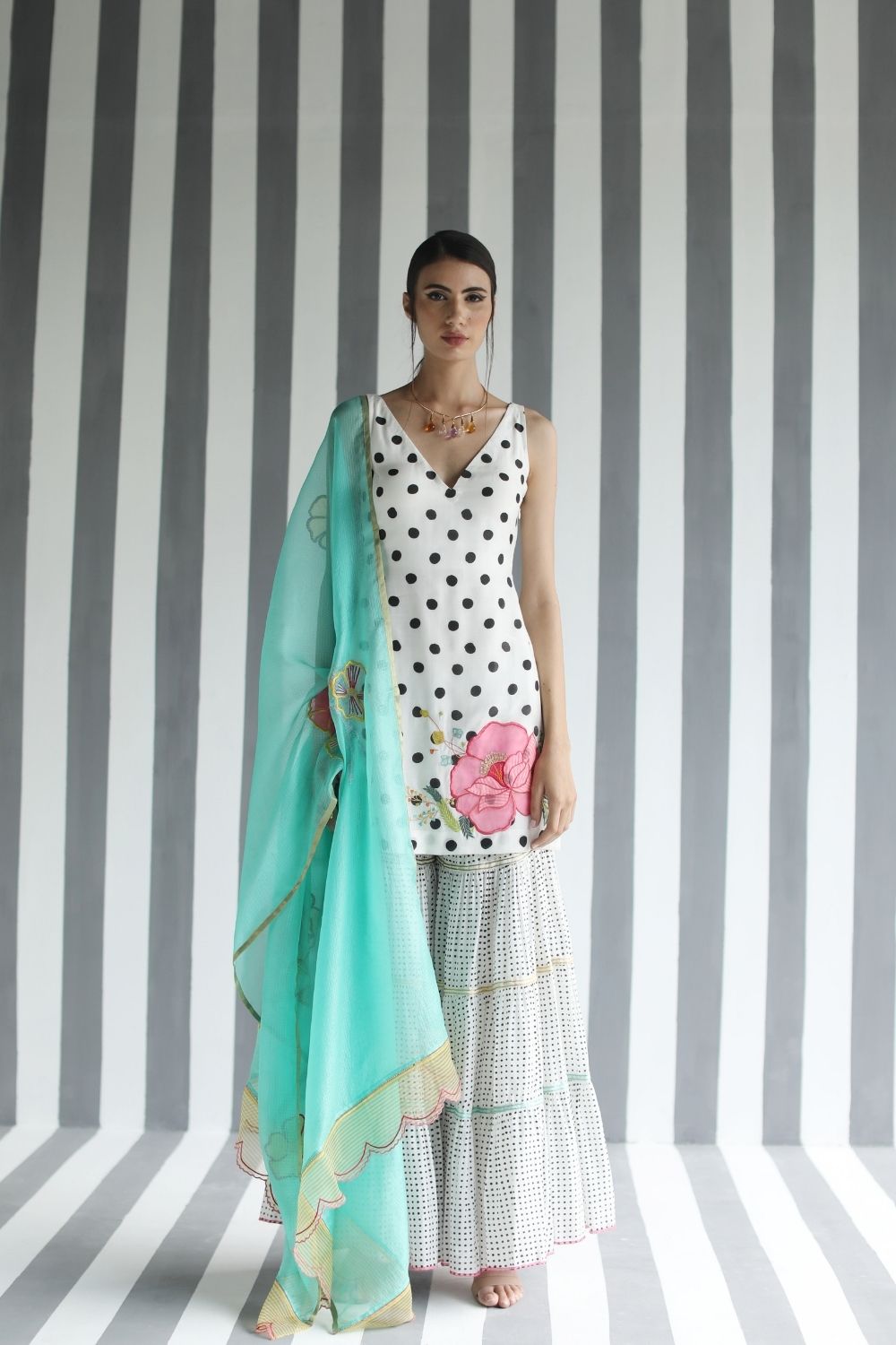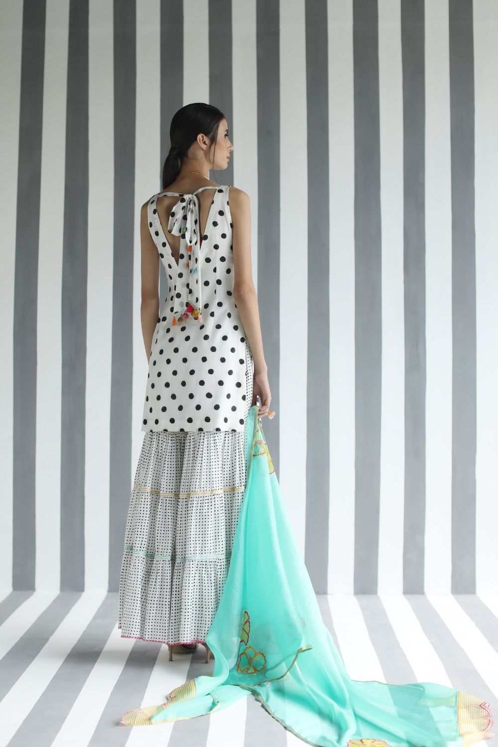 Printed cotton silk Back Bow Tie Short Kurti with Applique Embroidery paired with printed cotton silk tiered panel gharara and embroidered turquoise kota silk dupatta detailed with organza scalloped sides.