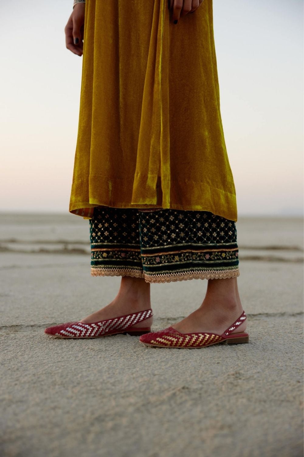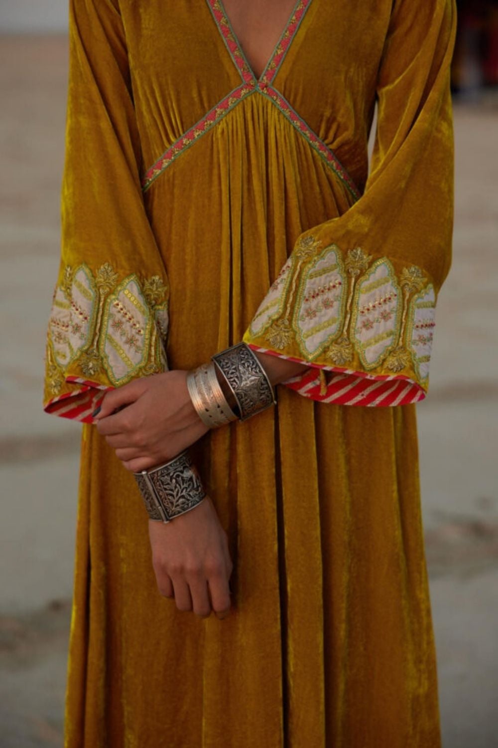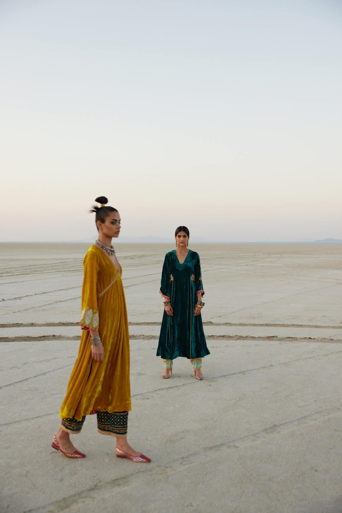 Their work is an ode to handcrafted Indian design — rooted in traditional embroidery techniques like zardozi, dabkaa, and fine threadwork, yet shaped into silhouettes that feel refreshingly contemporary. Clean cuts, relaxed forms, pure fabrics, and a distinctive palette come together to create pieces that travel seamlessly from India to Singapore and beyond.