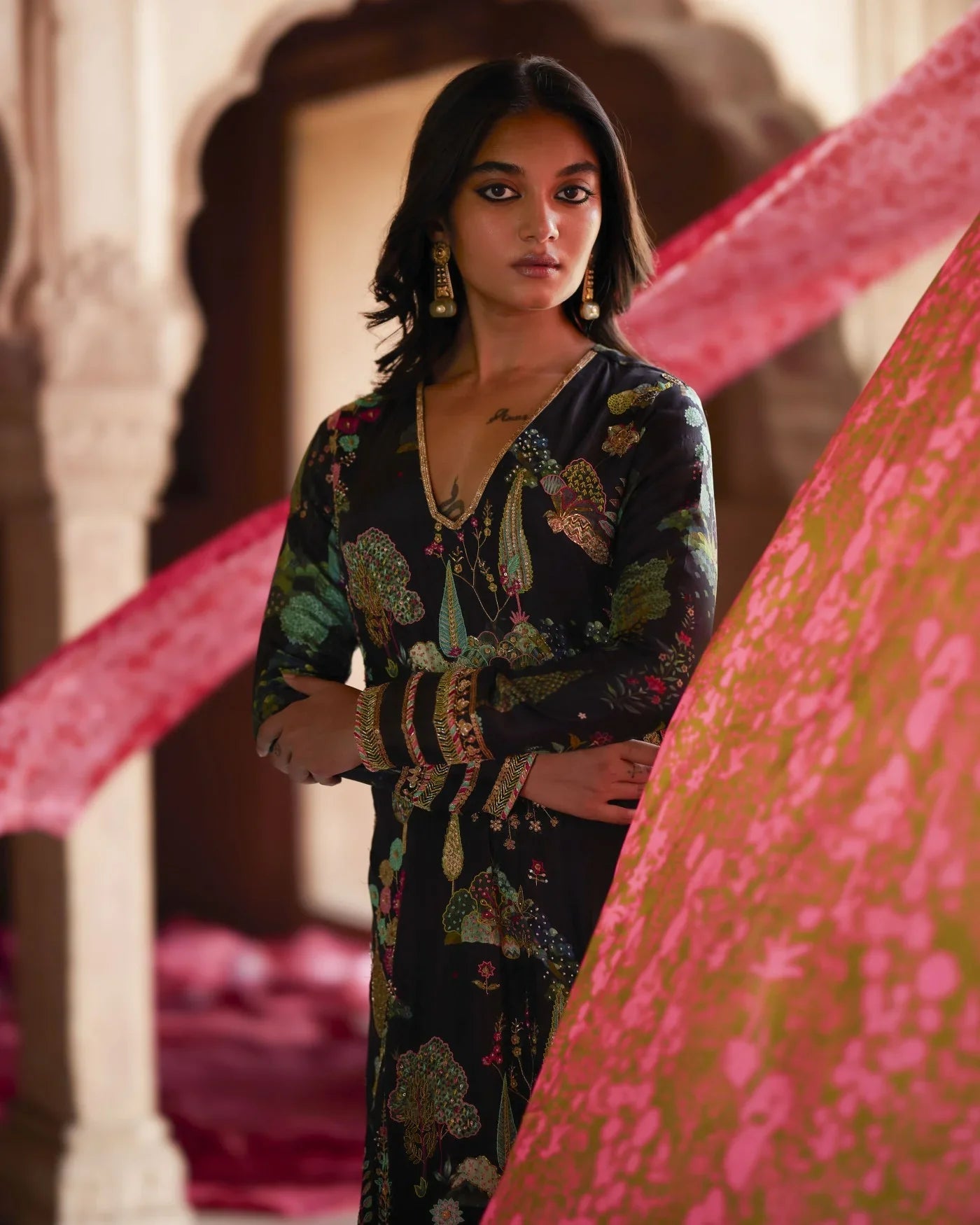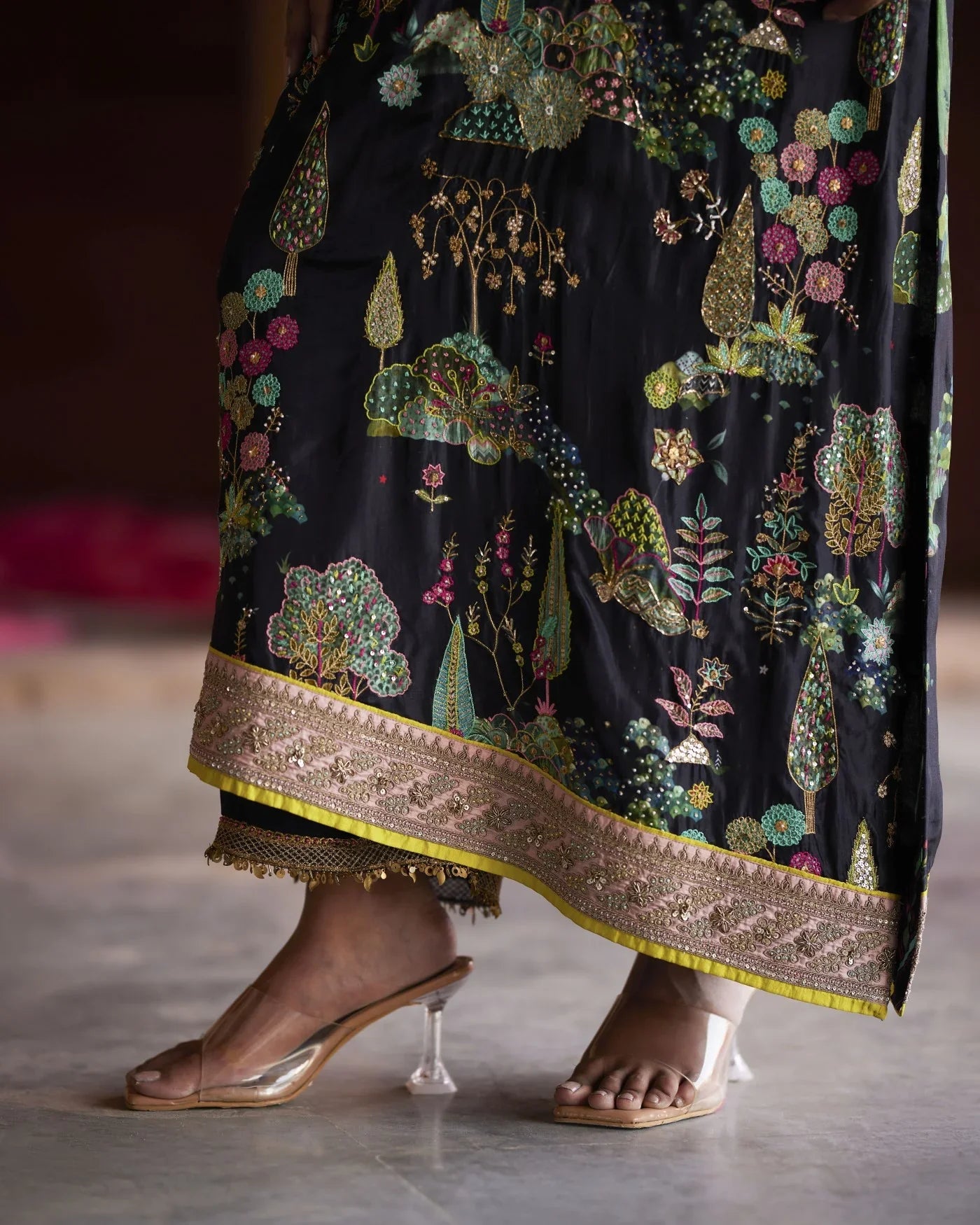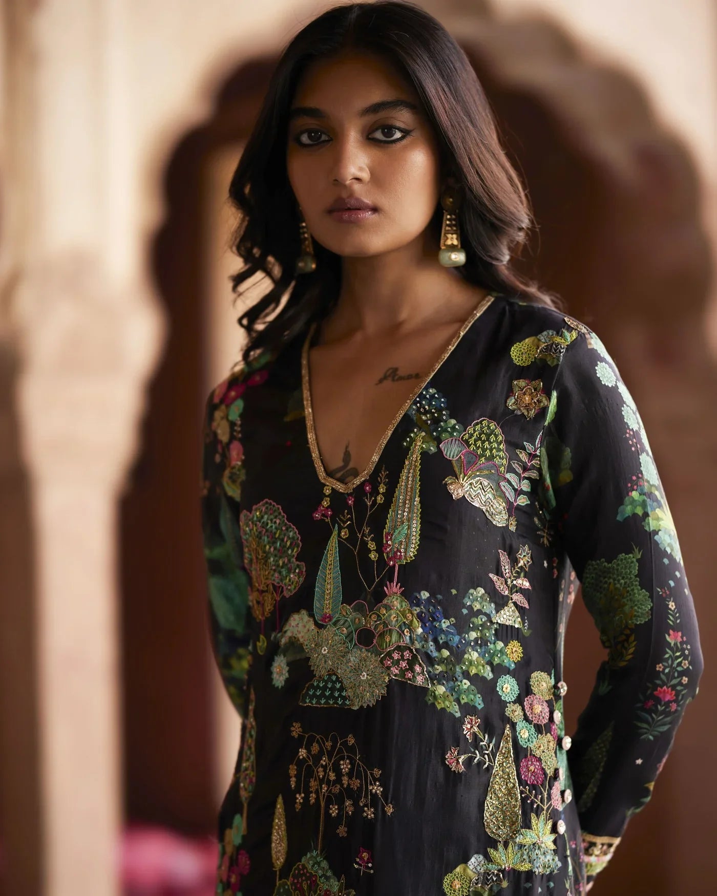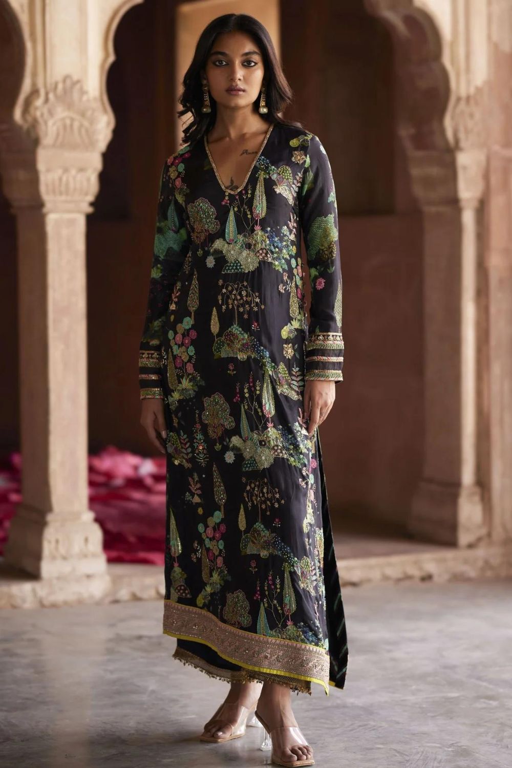 A Perfect ensemble for all occasions .The beautiful Nature Inspired print is the breath of fresh air in the gleaming Sunshine. Black hand embroidered crepe kurta with allover Pitta,Dabka and Resham work which goes back in the History of our rich Culture with a Contemporary Touch. the Kurta has an Asymmetrical Hemline and a Slit opening on one side paired with an embroidered palazzo .