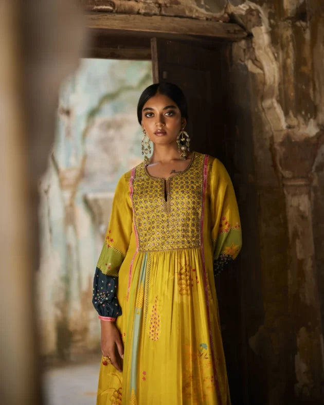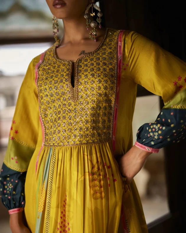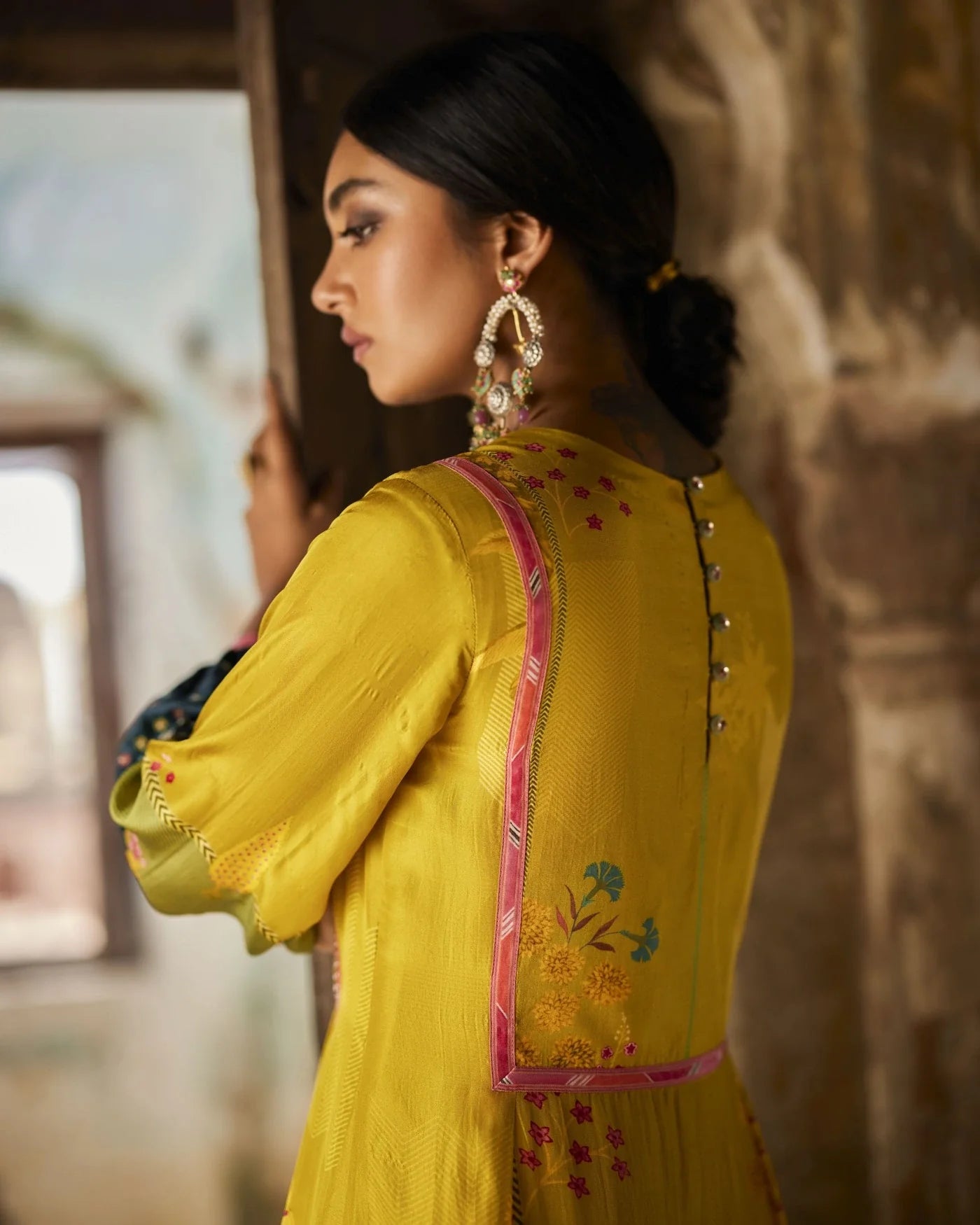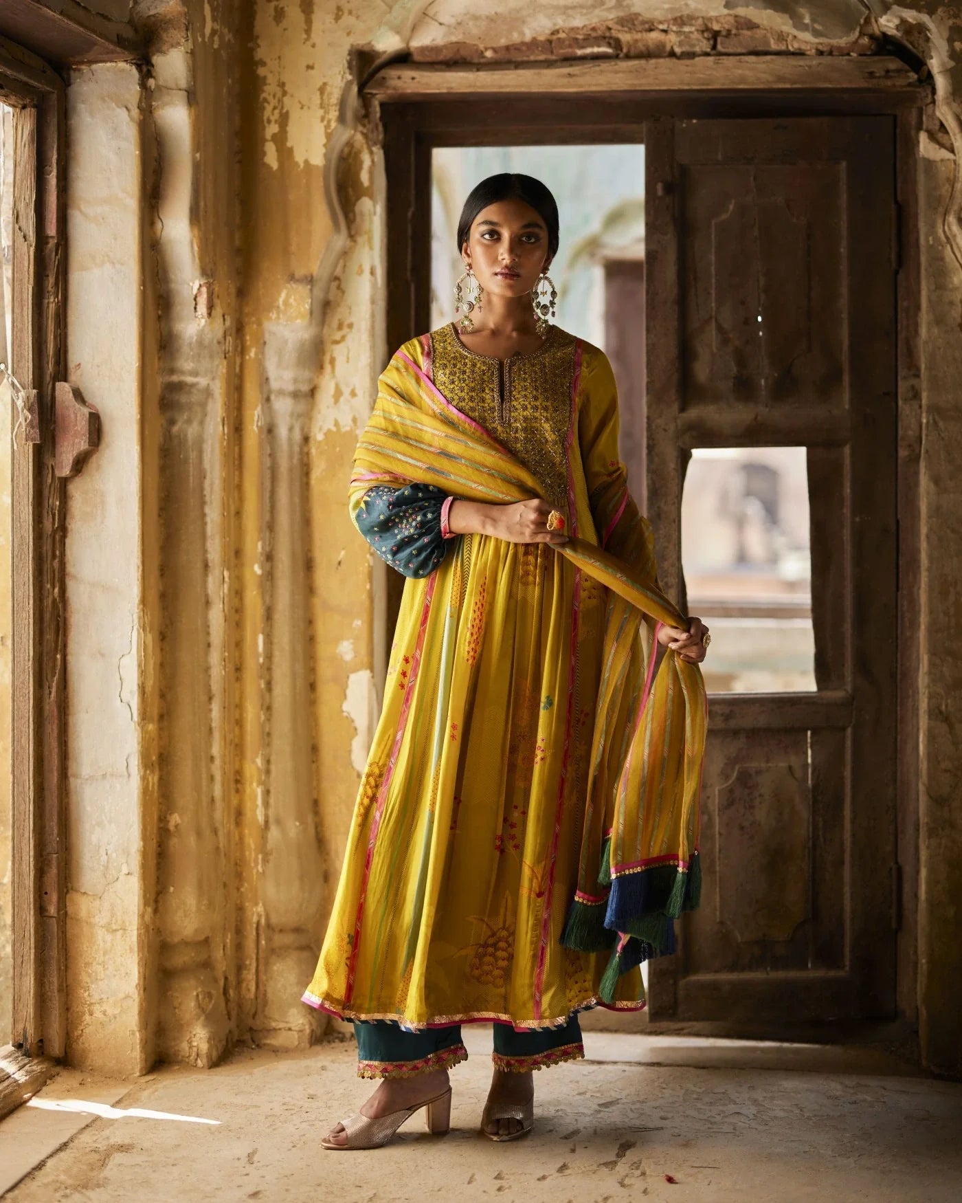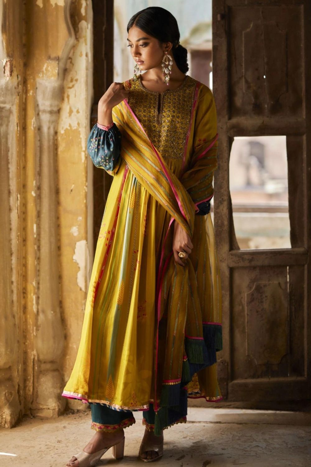 An elegant ensemble in printed Lime yellow front puckering silk kurta with hand embroidered yoke and sleeves. Its paired with delicately hand embroidered teal blue palazzo and Lime yellow printed organza dupatta with fringe detailing.