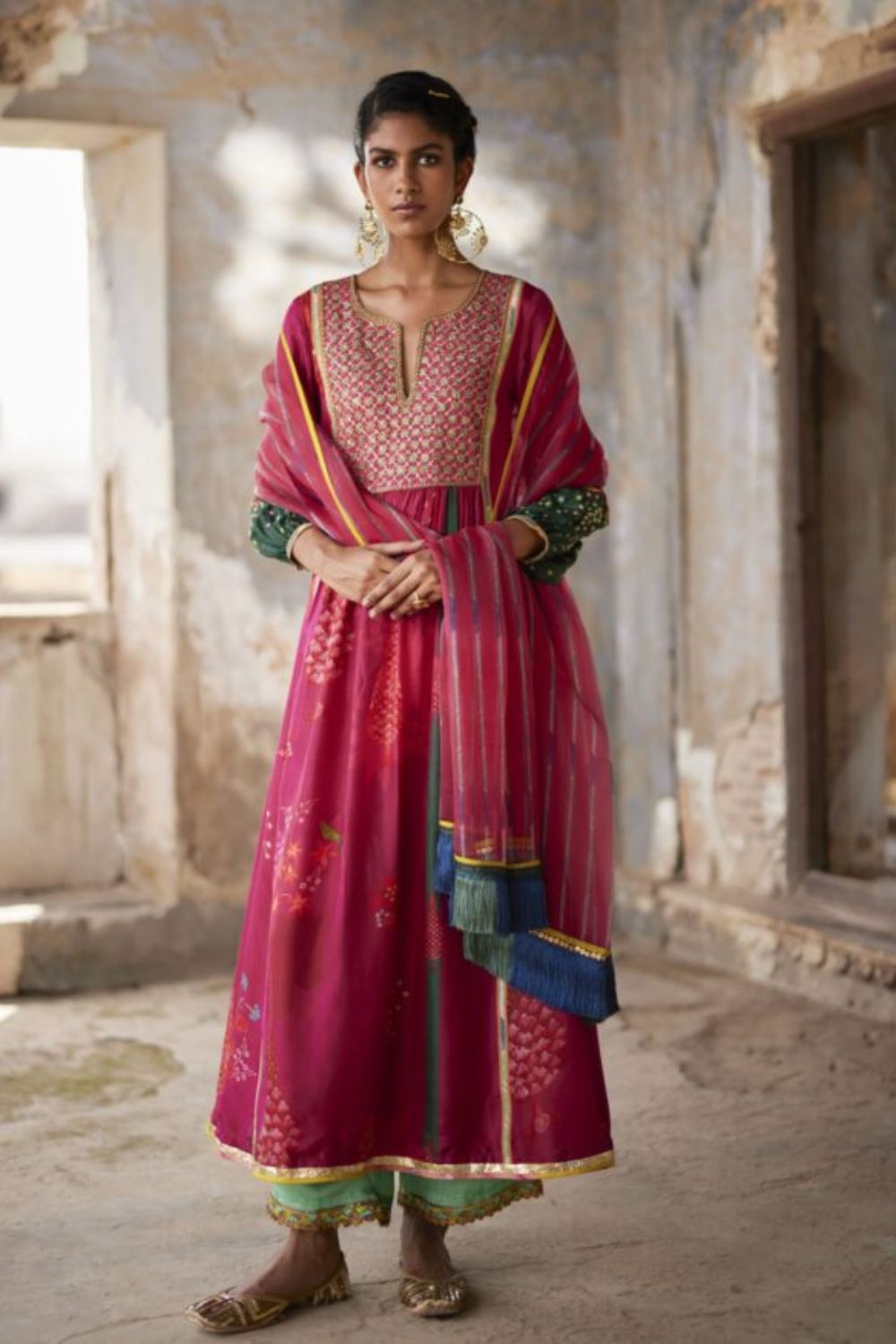 An elegant ensemble in printed magenta front puckering silk kurta with hand embroidered yoke and sleeves. Its paired with delicately hand embroidered powder blue palazzo and magenta printed organza dupatta with fringe detailing.