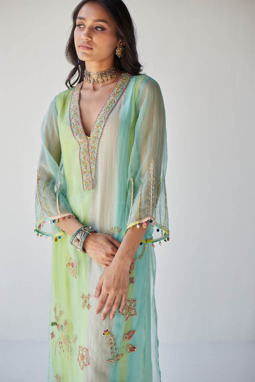 Powder blue organza kurta with intricate hand embroidery paired with embroidered bright green palazzo . Along with blush pink hand embroidered organza dupatta .