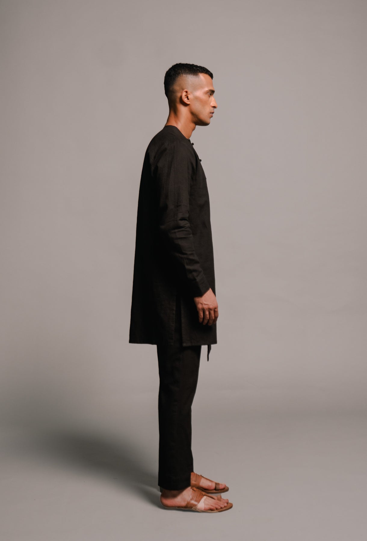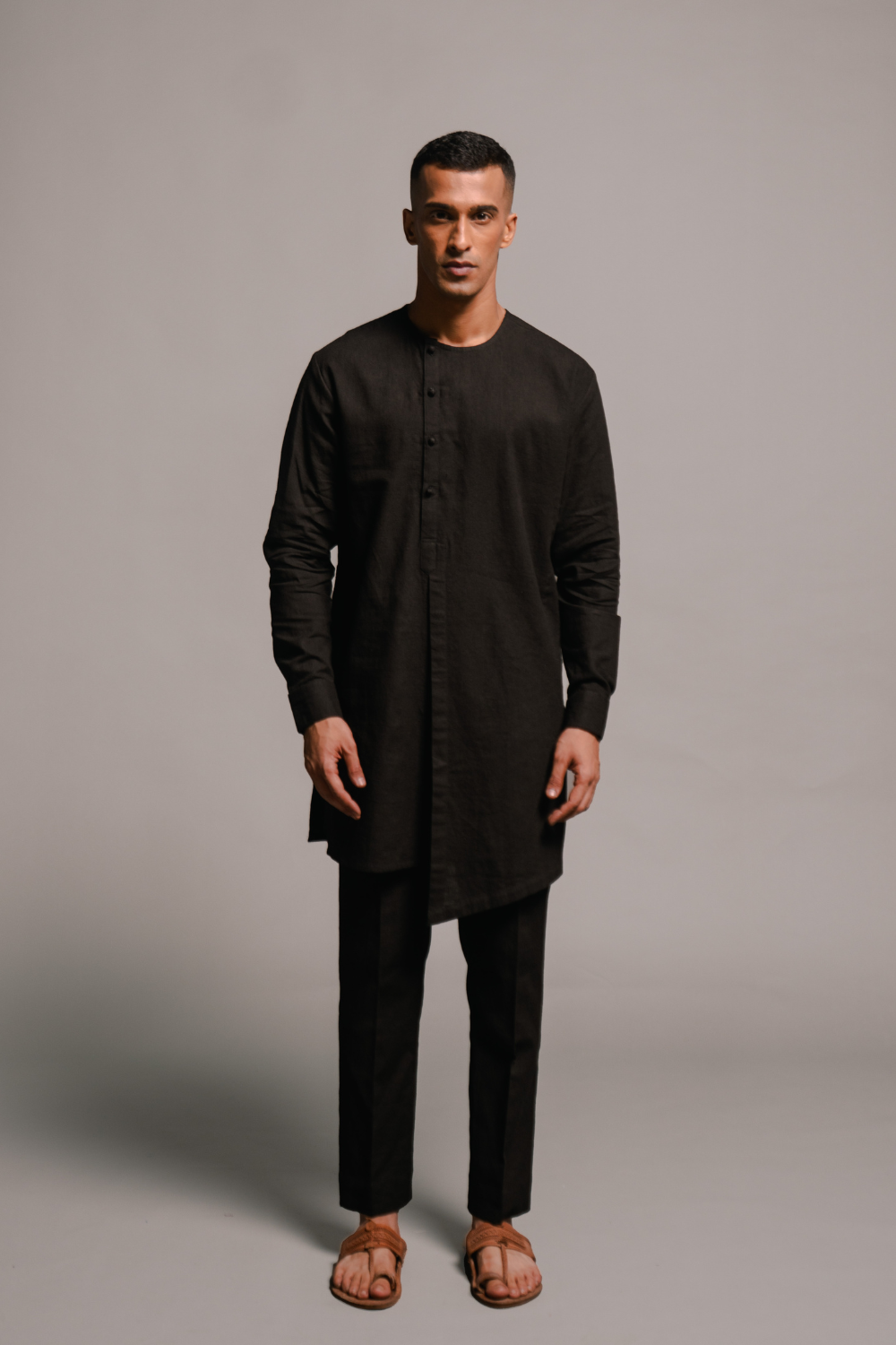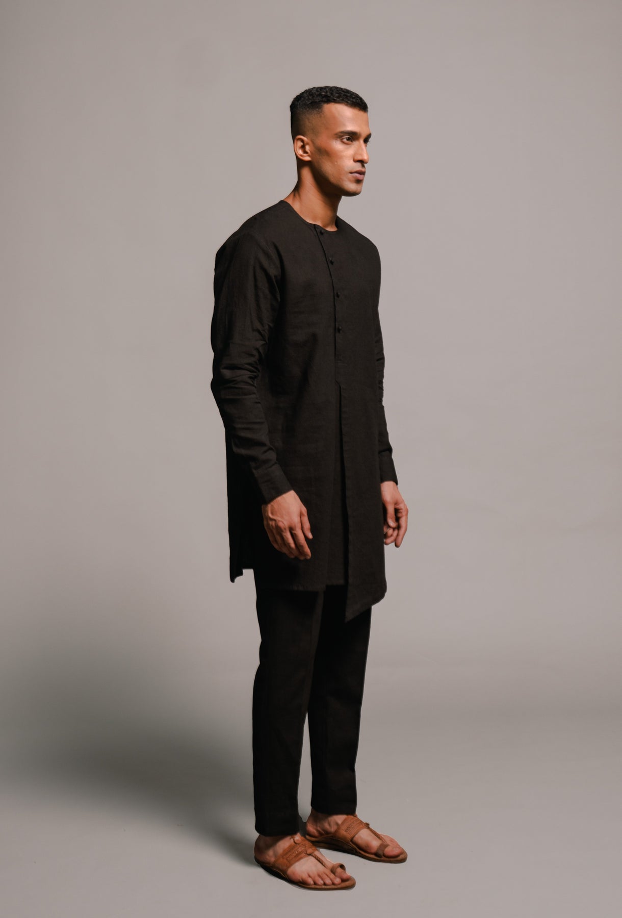 This set is a refined blend of contemporary design and timeless craftsmanship. The kurta features a front pleat and asymmetric placket, accented with handcrafted potli buttons that bring a modern twist to its minimalist silhouette while honoring traditional artistry. Paired with pleated pants, tailored for a clean yet comfortable fit, this ensemble offers both structure and ease. The breathable co-linen fabric ensures all-day comfort, making it perfect for both casual and formal occasions. Together, they offer understated elegance with thoughtful details, seamlessly blending heritage with modern sophistication.