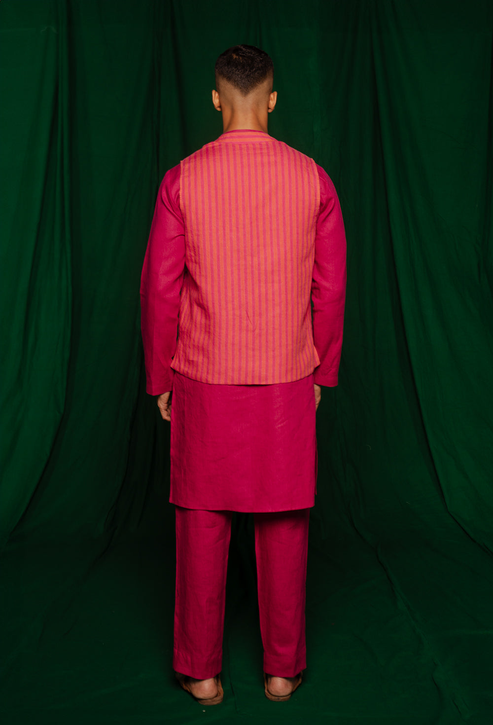 This Nehru jacket showcases a refined blend of traditional charm and modern craftsmanship. Crafted from pure linen with a structured mandarin collar, it features timeless finely woven linen. The front pockets and sleek button closure add both functionality and style, making it a versatile layering piece. Whether worn over a kurta or paired with trousers, this jacket effortlessly elevates your festive or semi-formal look with its understated elegance.