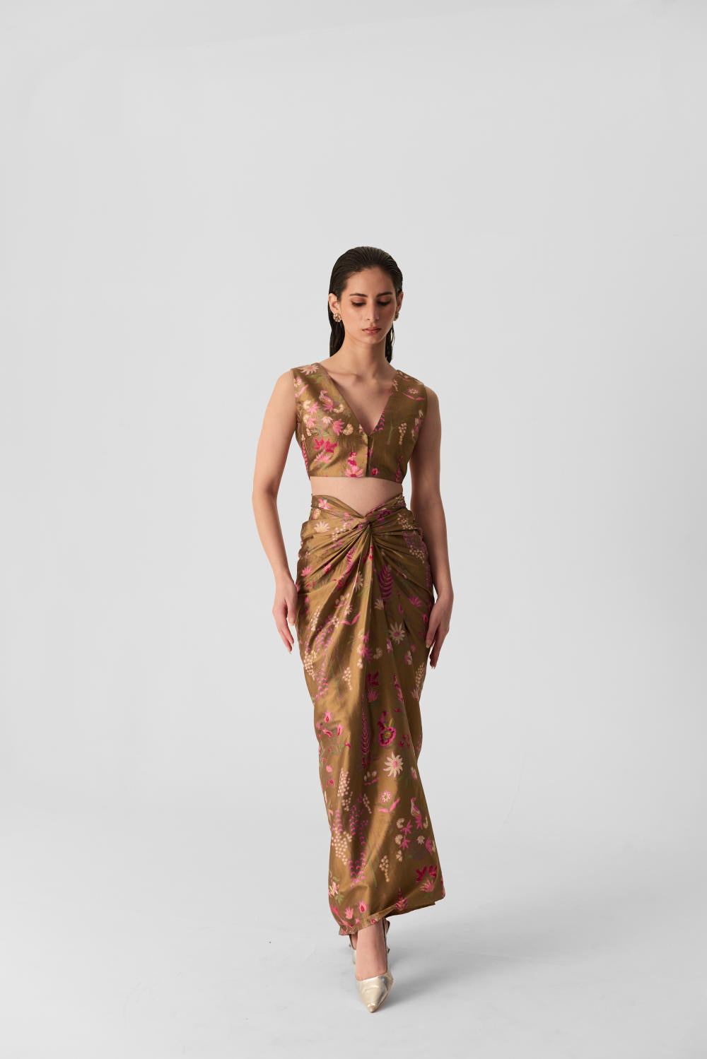 The skirt features a modern front twisted knot, adding a contemporary touch, and is secured with a center-back zipper and hook-and-eye closure for a seamless fit. Paired with a matching V-neck blouse in the same print, the blouse is designed with a front hook-and-eye closure for a tailored and flattering fit.