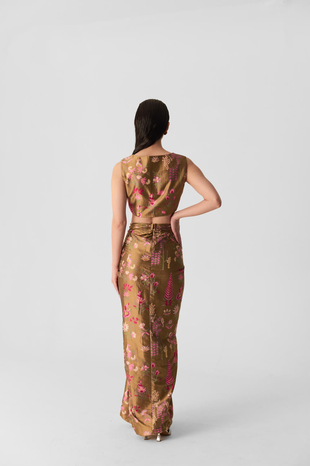 This elegant skirt set is made from premium pure silk, adorned with a beautiful Bahar pink print, crafted through traditional hand-block printing .