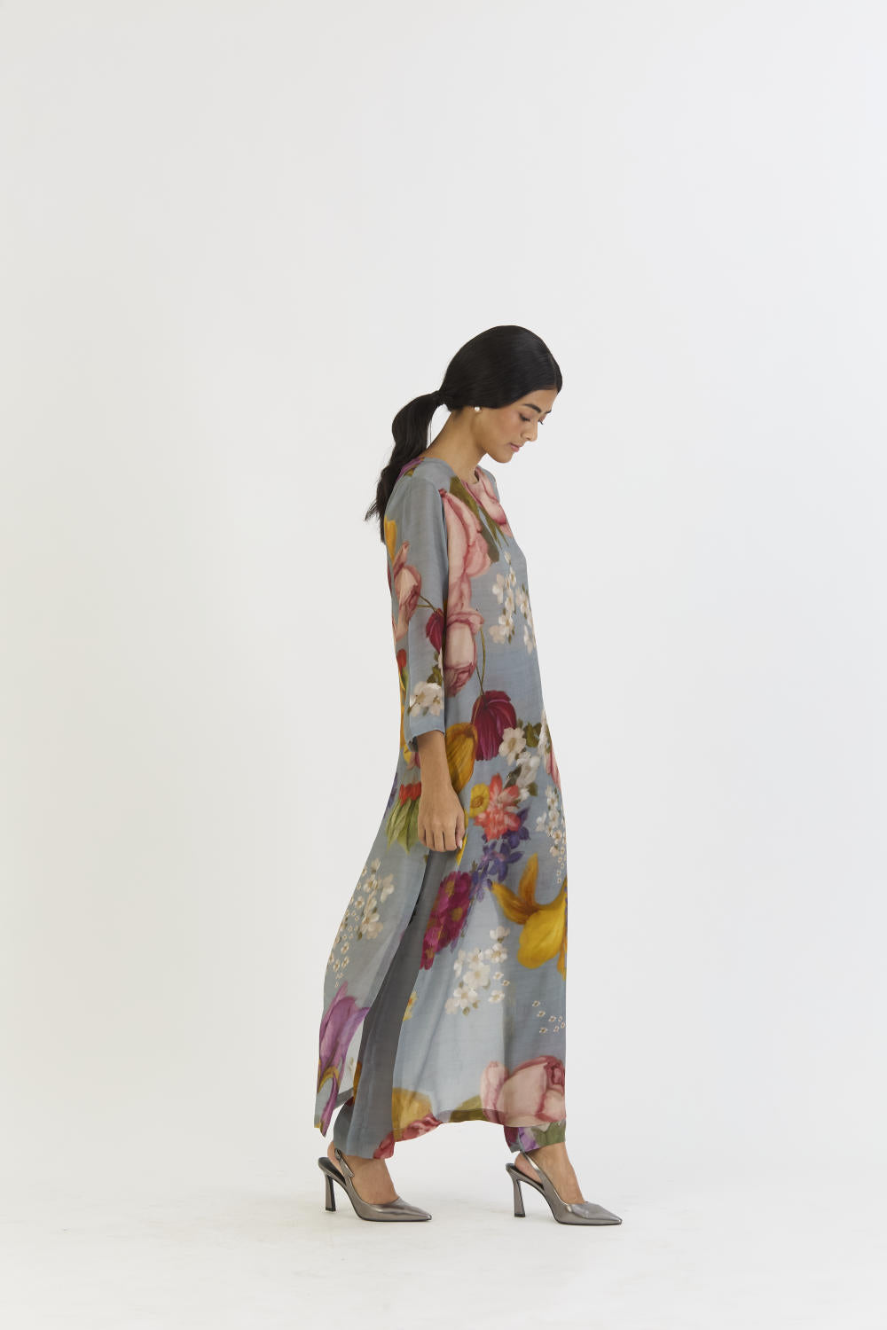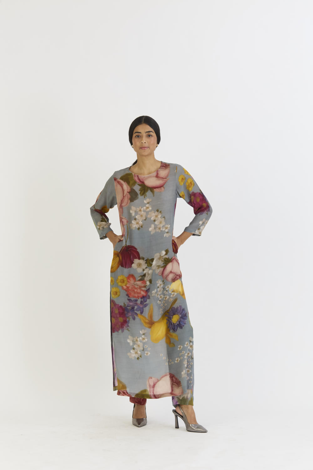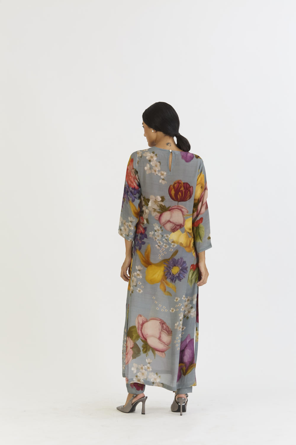 The kurta features a modern zero neckline with a charming keyhole detail at the back. Paired with matching pants adorned with the same exquisite print, this set is perfect for any occasion. The pants offer practical side pockets, back elastication, and front drawstrings for a customizable fit.