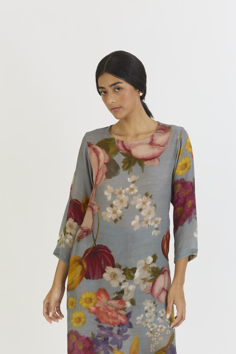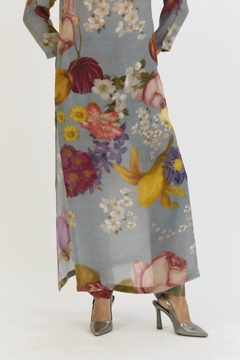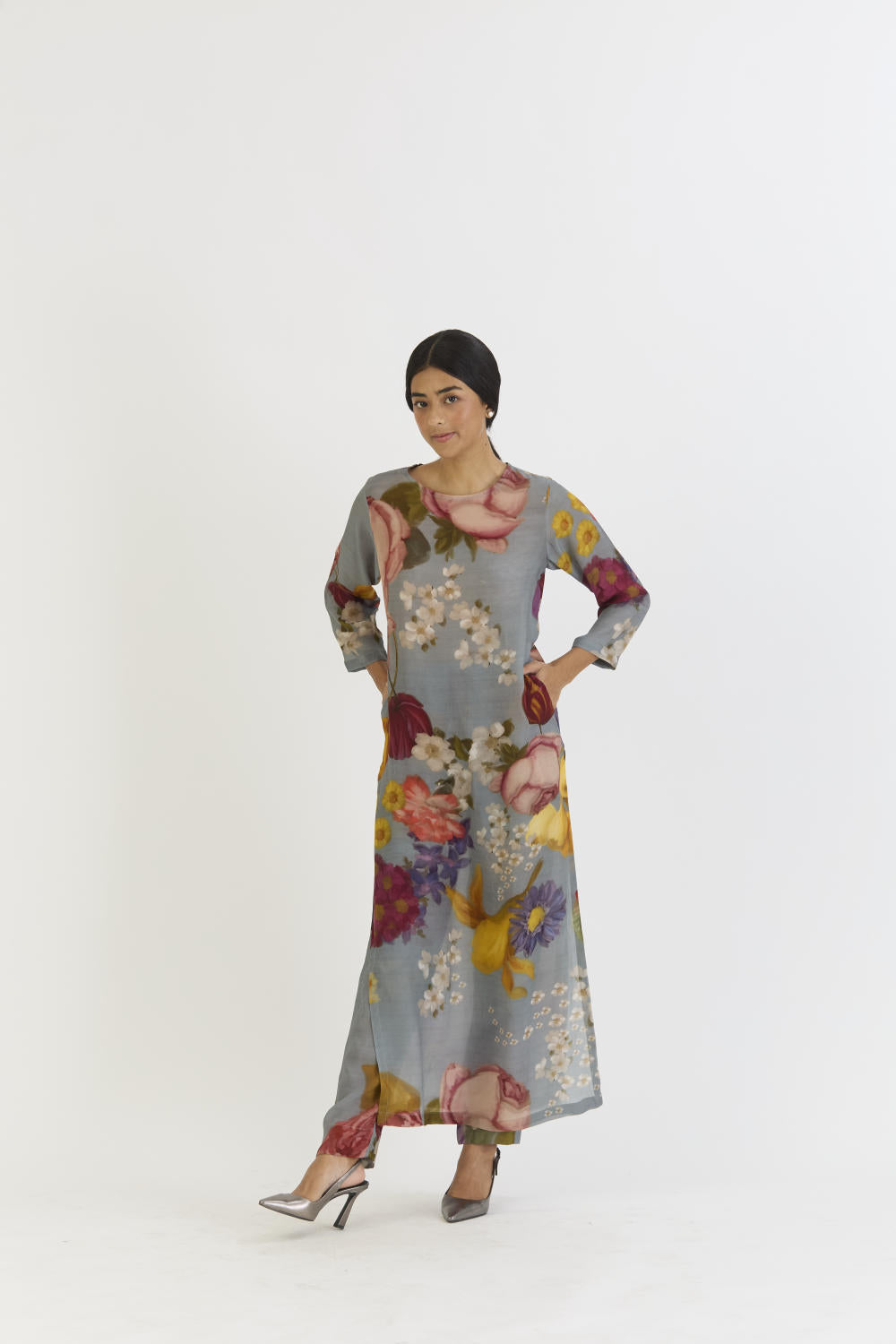 The kurta features a modern zero neckline with a charming keyhole detail at the back. Paired with matching pants adorned with the same exquisite print, this set is perfect for any occasion. The pants offer practical side pockets, back elastication, and front drawstrings for a customizable fit.