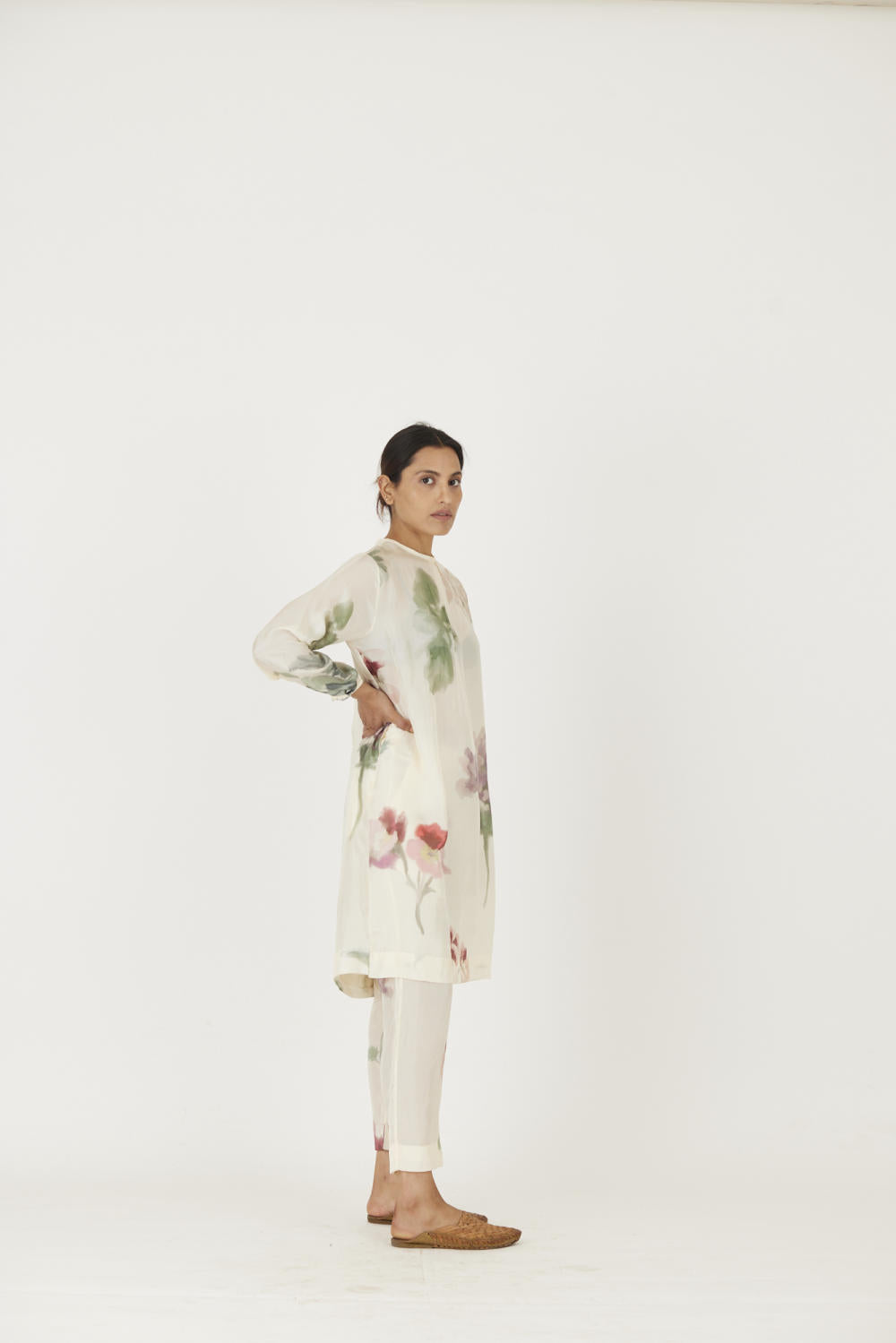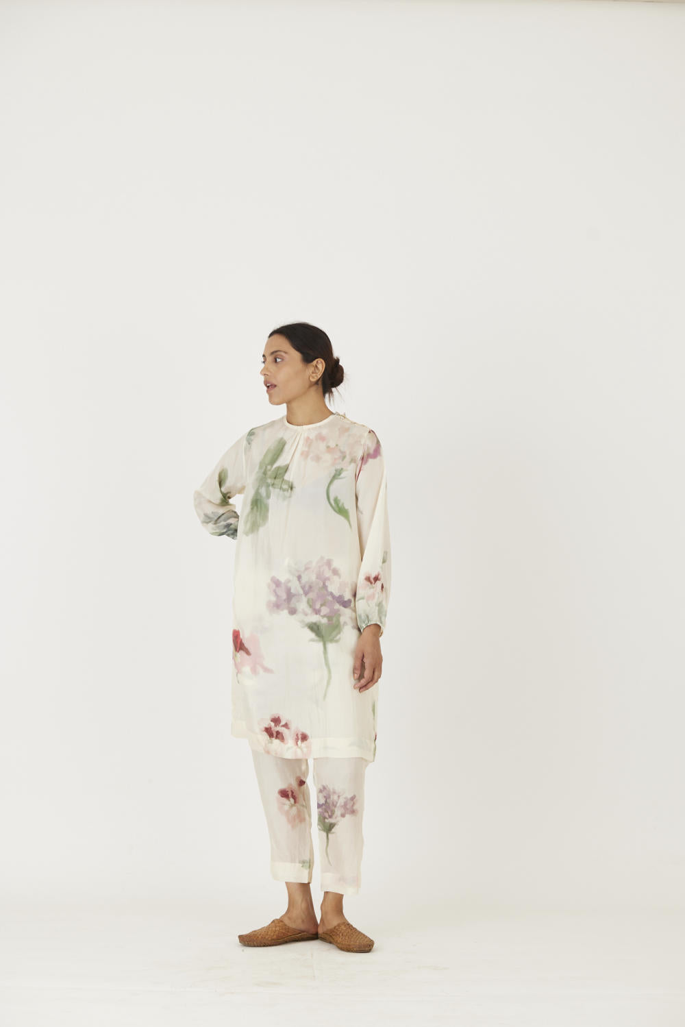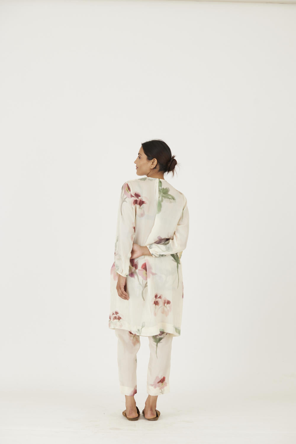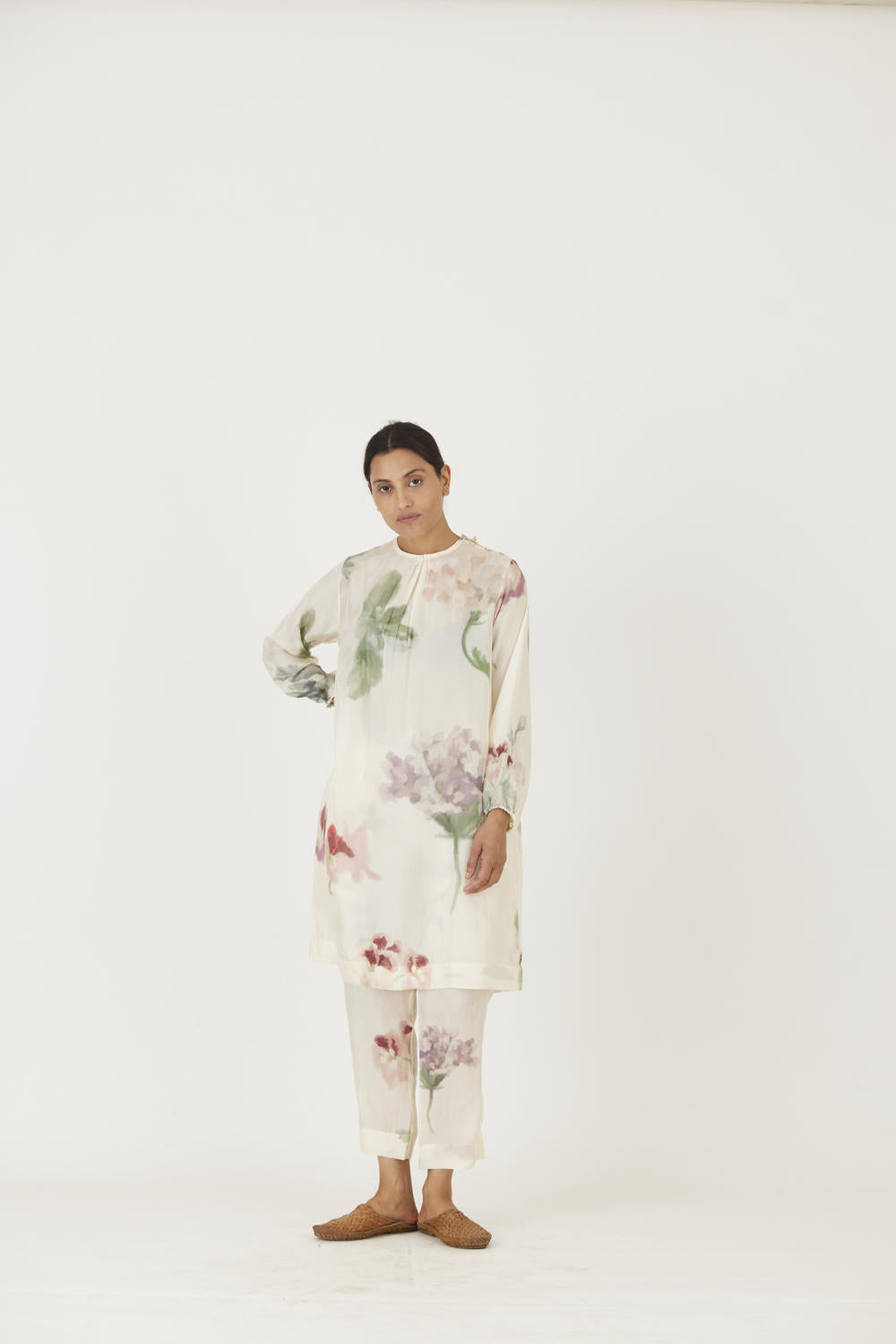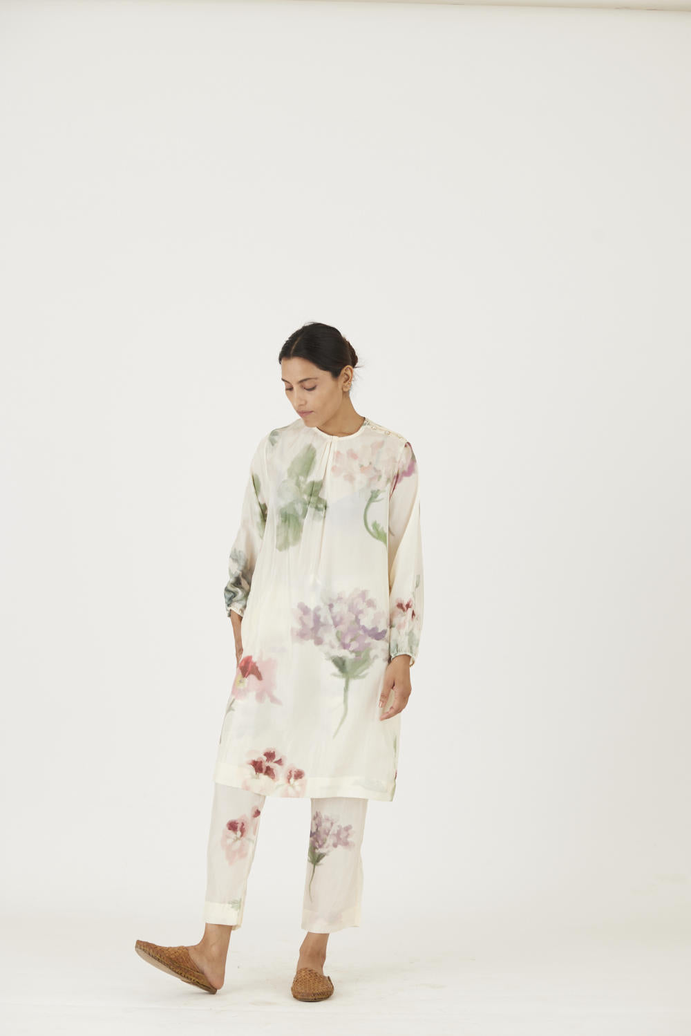 The print features in hand drawn botanical motifs in a soft white base. The set is crafted in the juliet print carefully printed on Pure silk featuring white pearls on the neck. The set includes a kurta and pants.