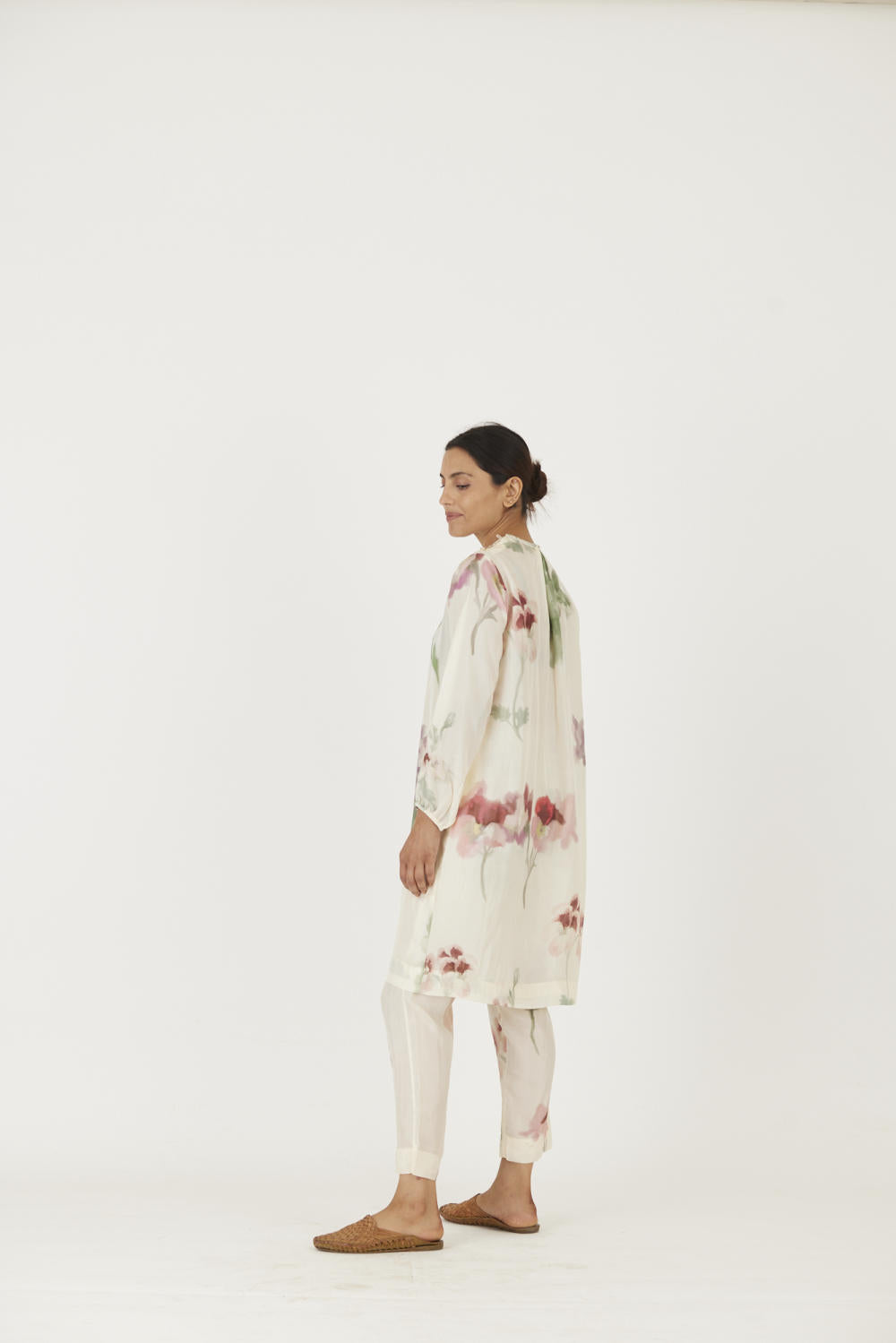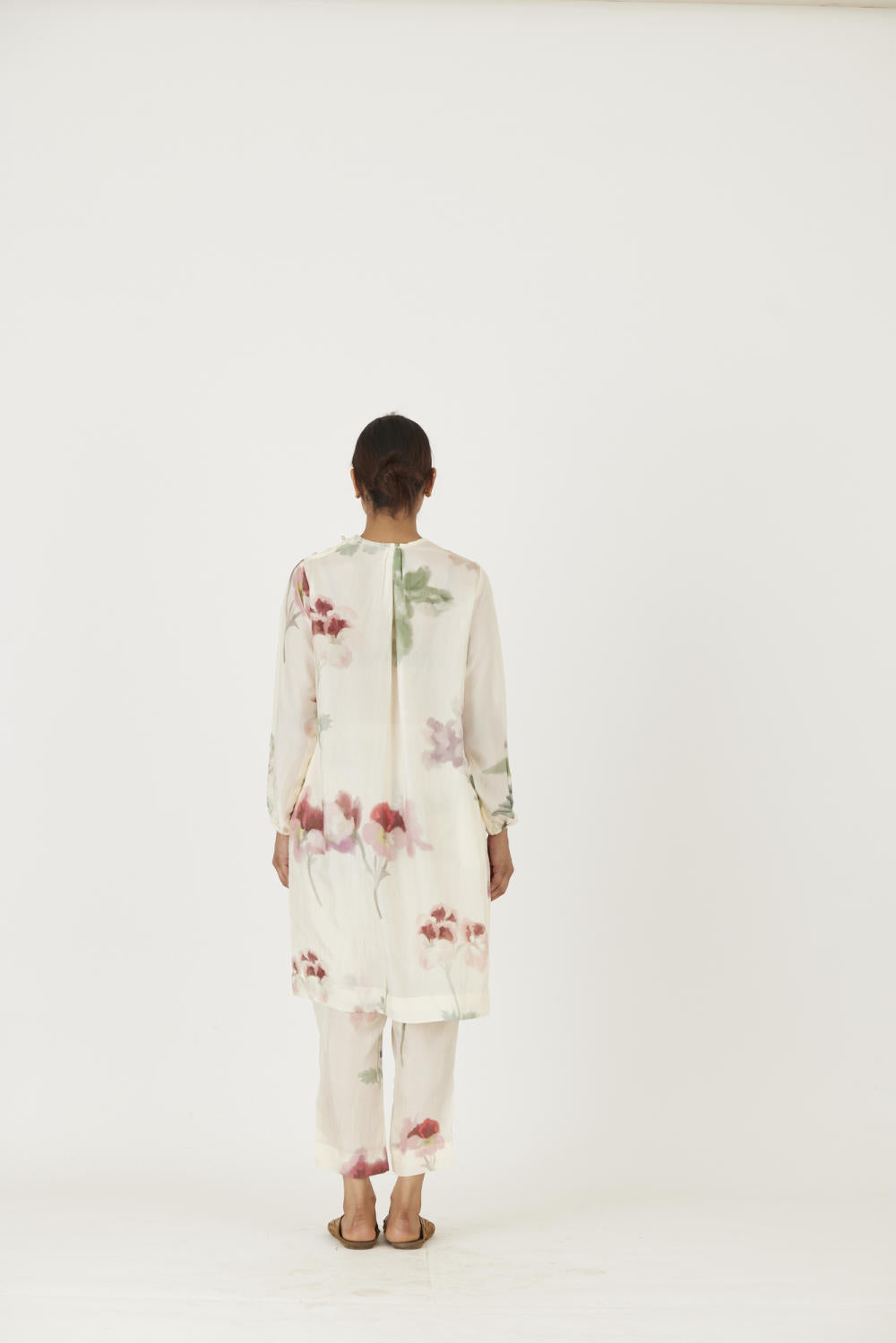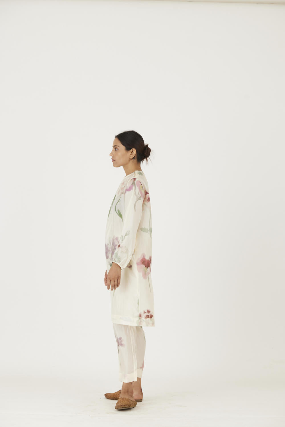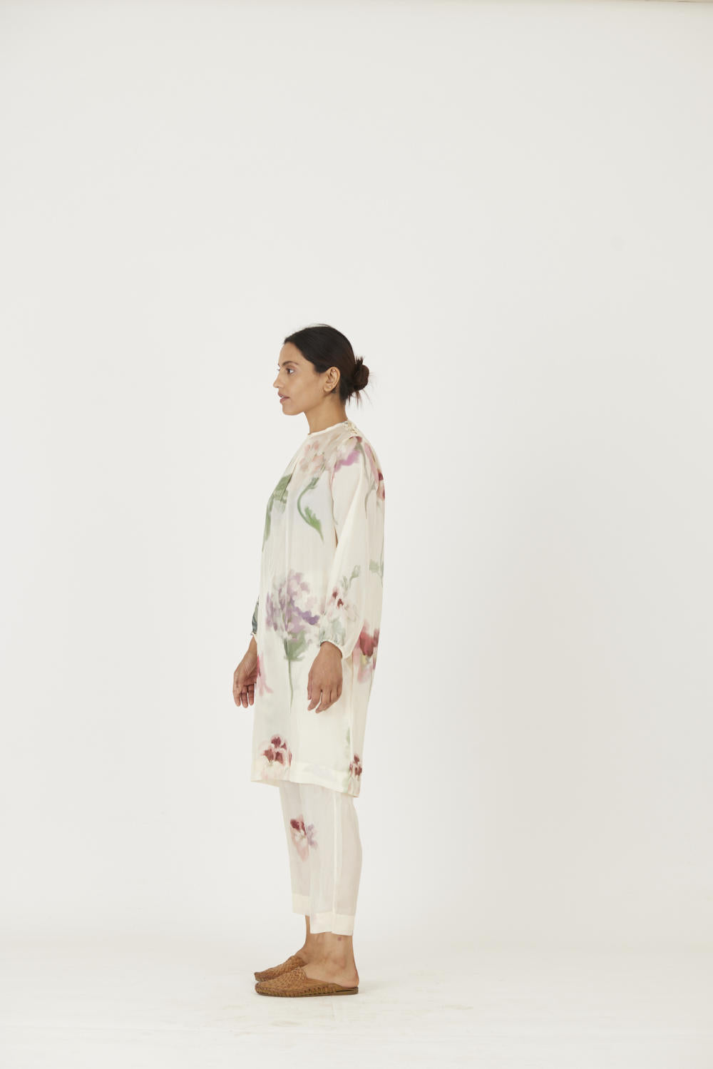 The print features in hand drawn botanical motifs in a soft white base. The set is crafted in the juliet print carefully printed on Pure silk featuring white pearls on the neck. The set includes a kurta and pants.