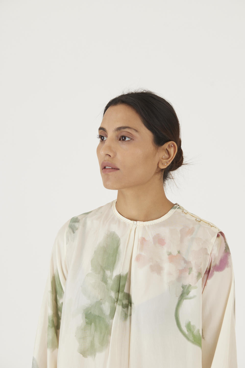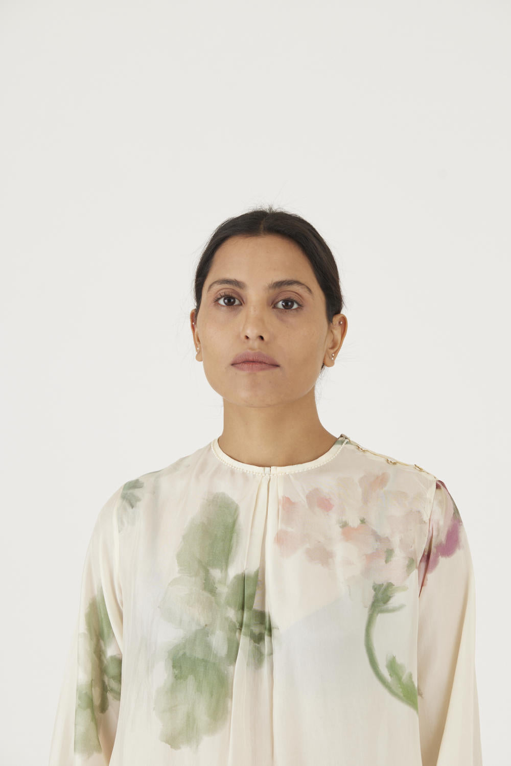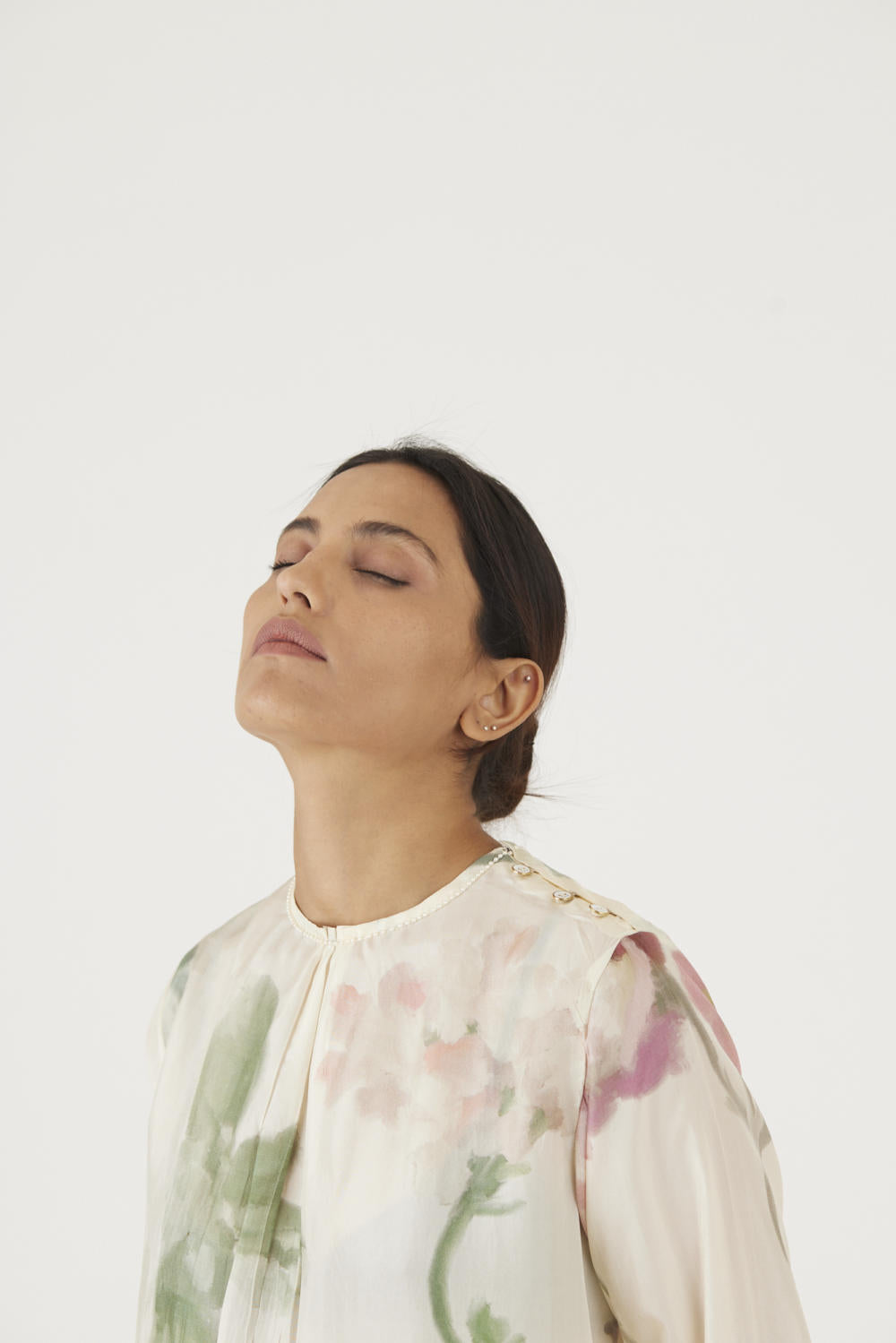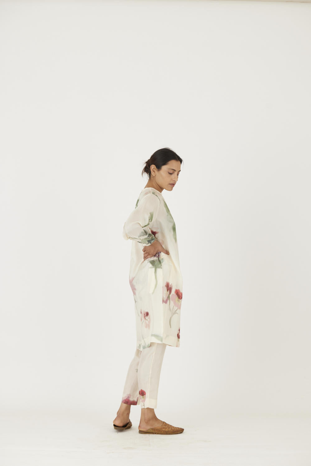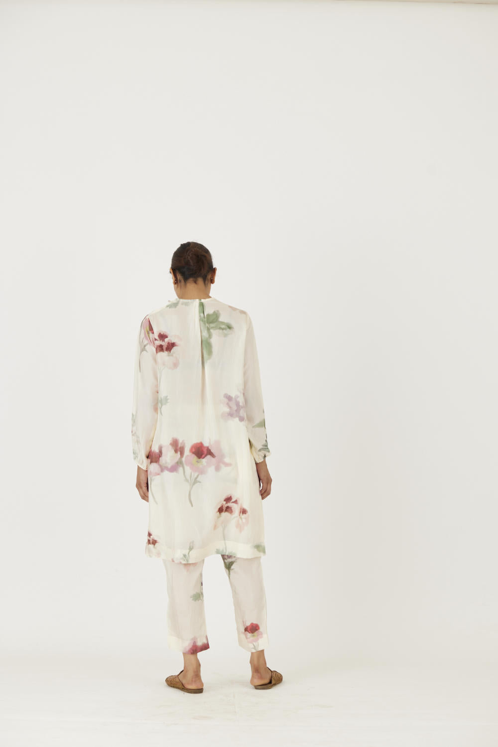 The print features in hand drawn botanical motifs in a soft white base. The set is crafted in the juliet print carefully printed on Pure silk featuring white pearls on the neck. The set includes a kurta and pants.