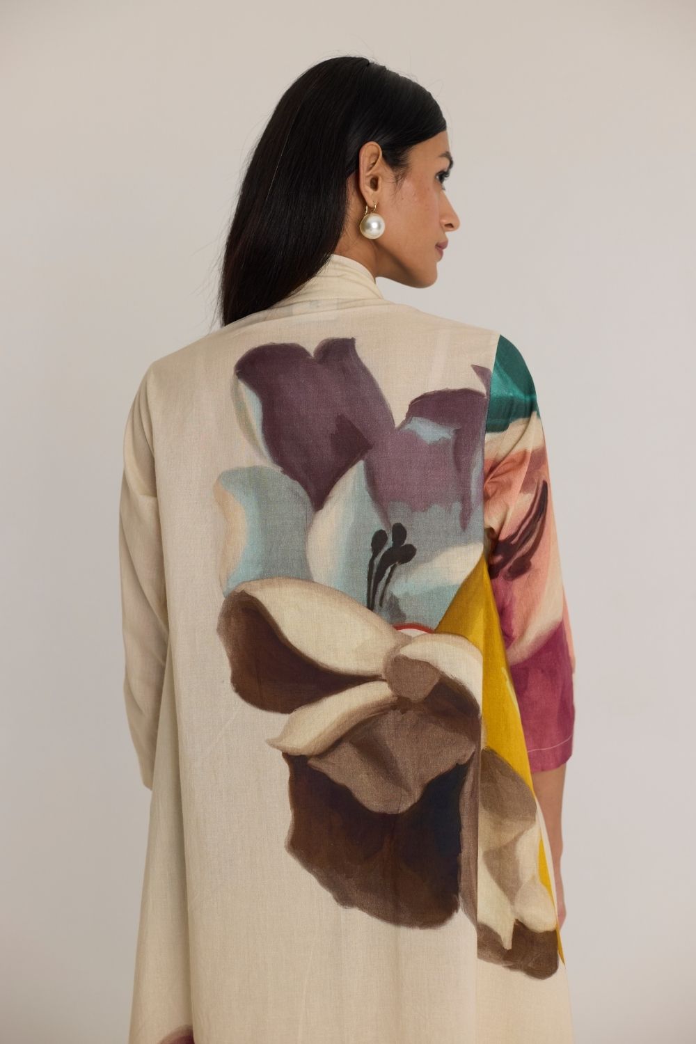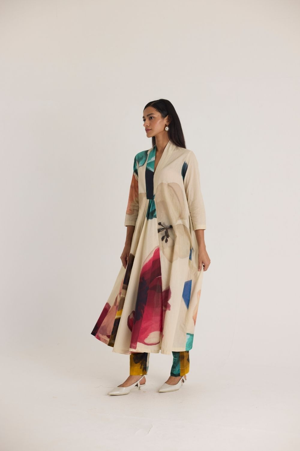 This elegant long kurta set features a flowing silhouette with a bold, artistic floral print in vibrant hues. The open-front jacket, with a deep V-neckline and pleated details, drapes beautifully over