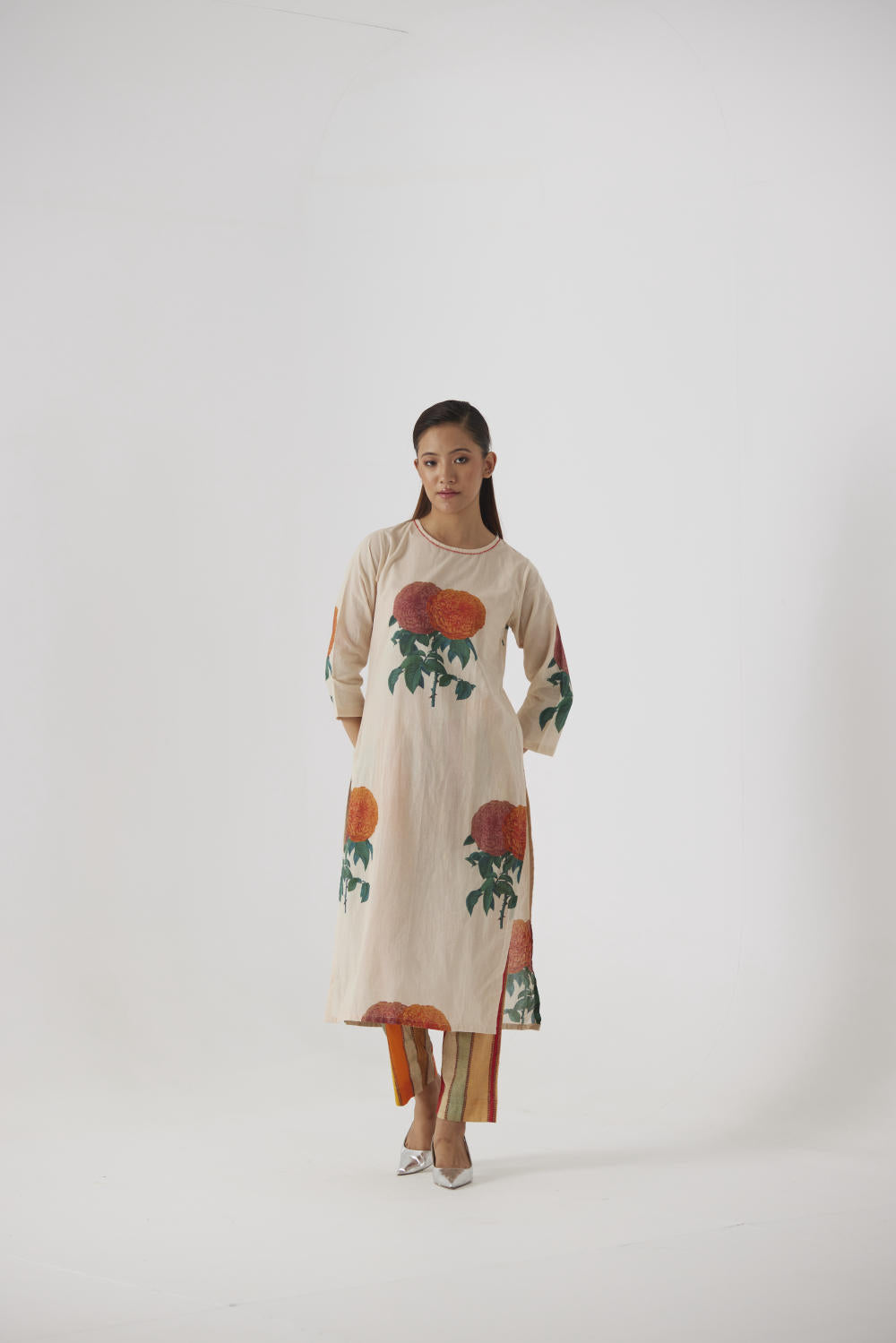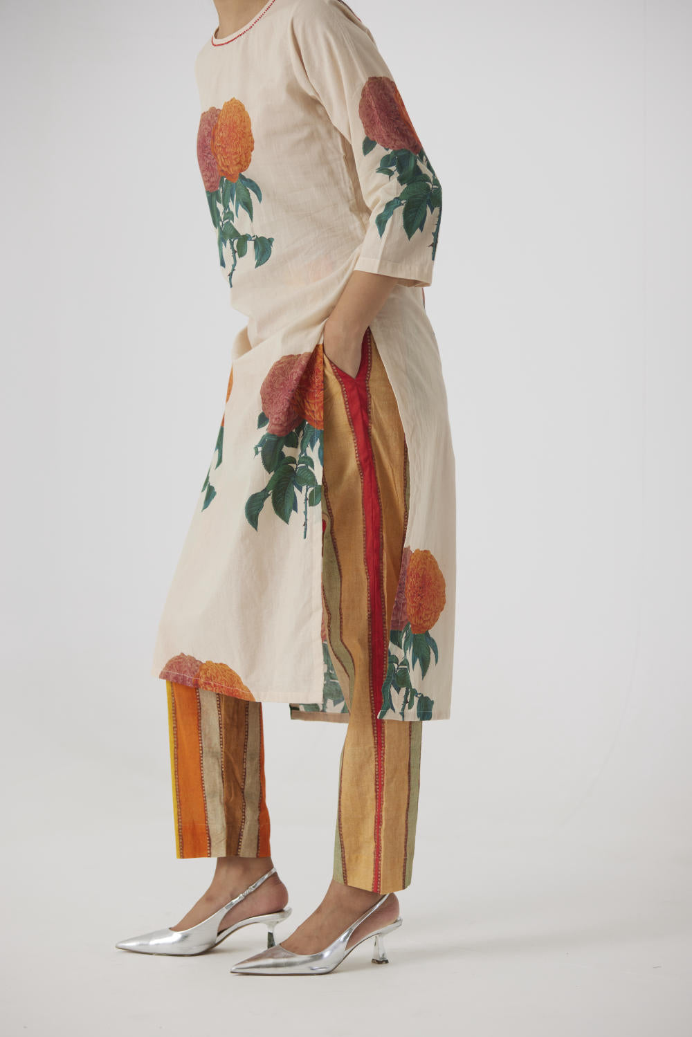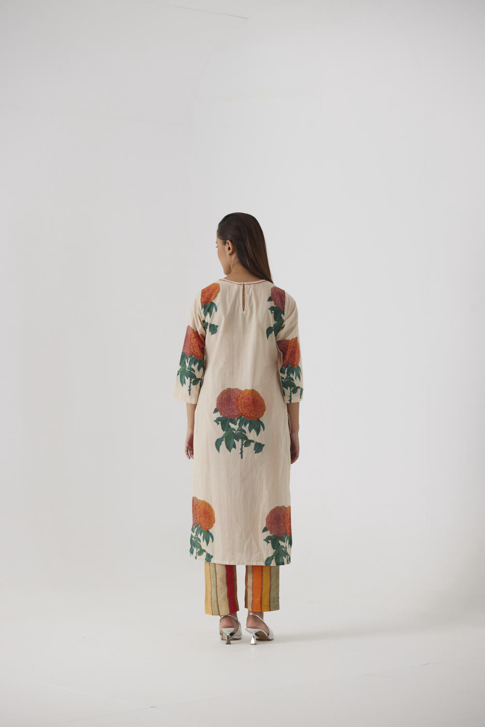 Discover timeless charm in our Cotton Kurta, adorned with hand-drawn Marigold flower motifs. Complemented by striped pants featuring intricate block print details, this ensemble exudes effortless sophistication.