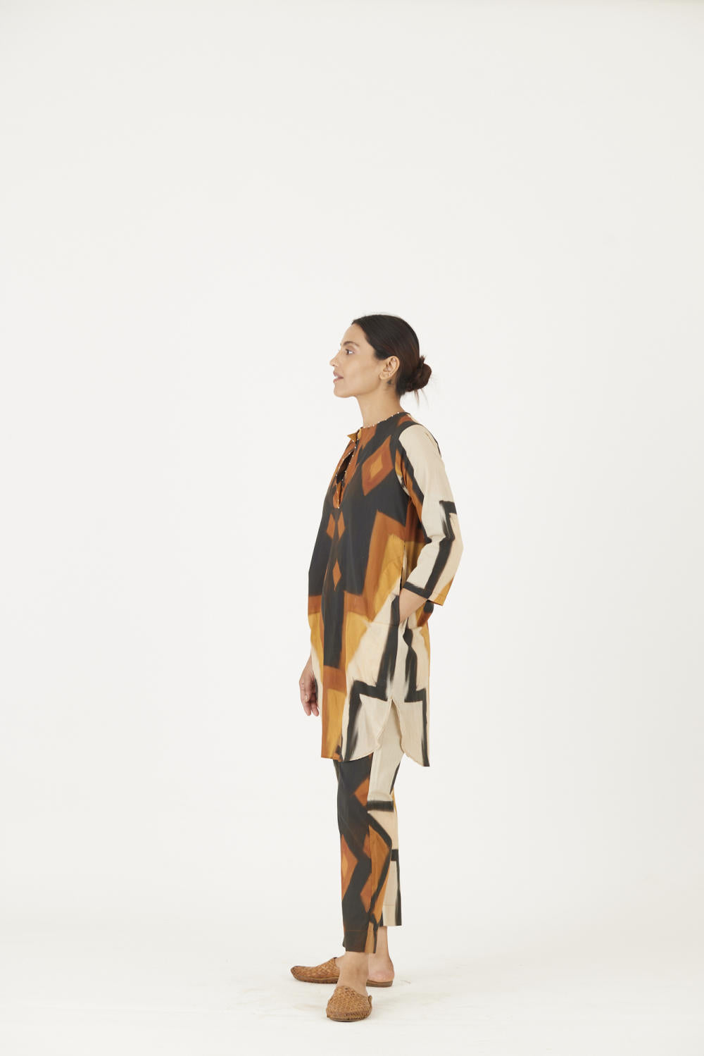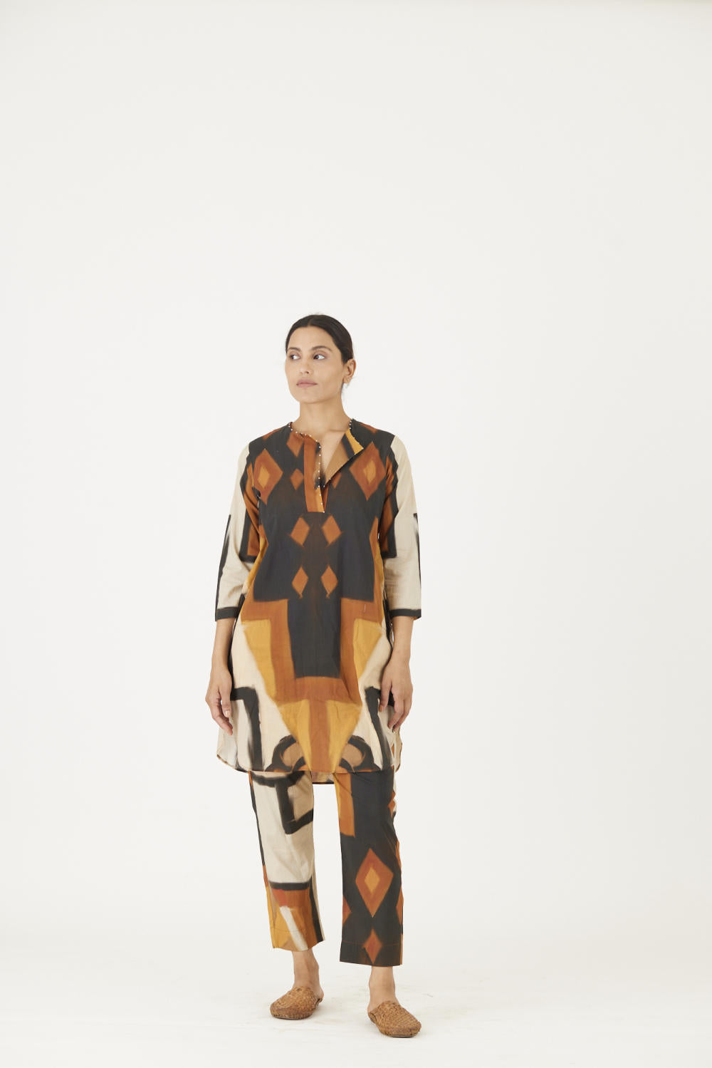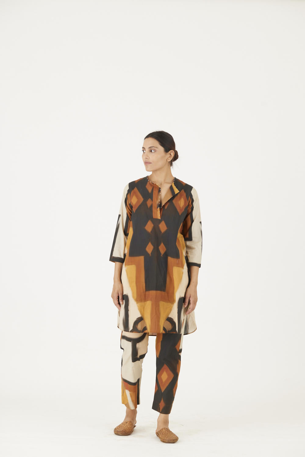 The print is inspired from the ancient rugs of Egypt and features a unique placement of florals and geomentric motifs . The set includes a short kurta with side slits and 2" kurta patti . It comes with complimenting pants.