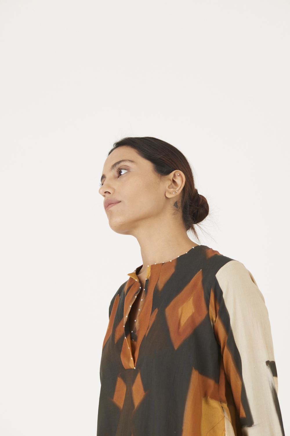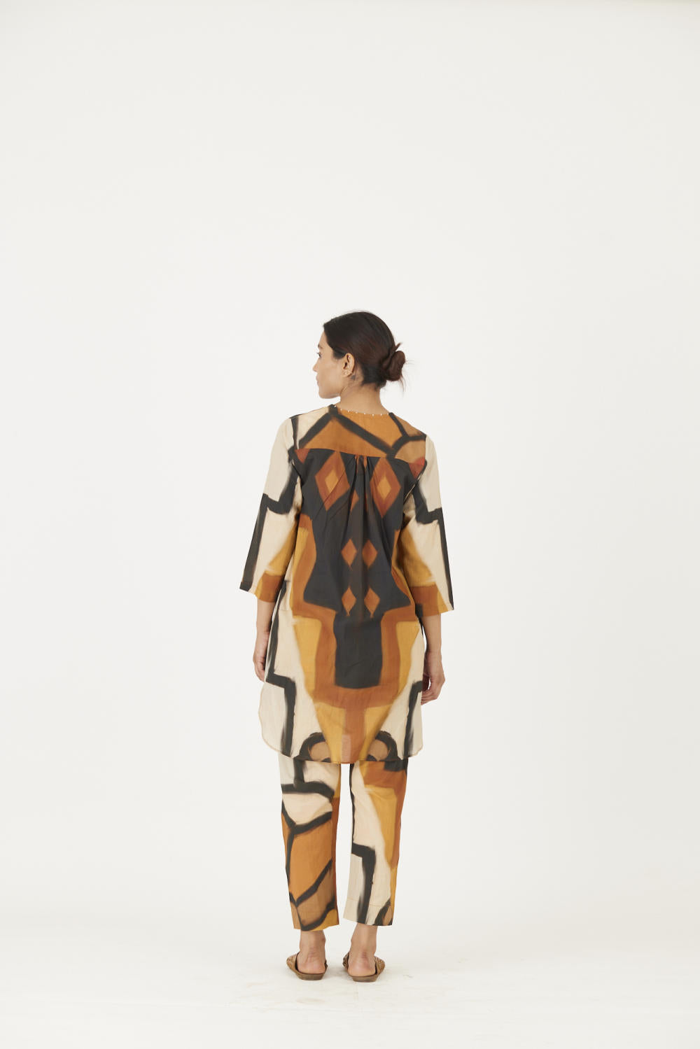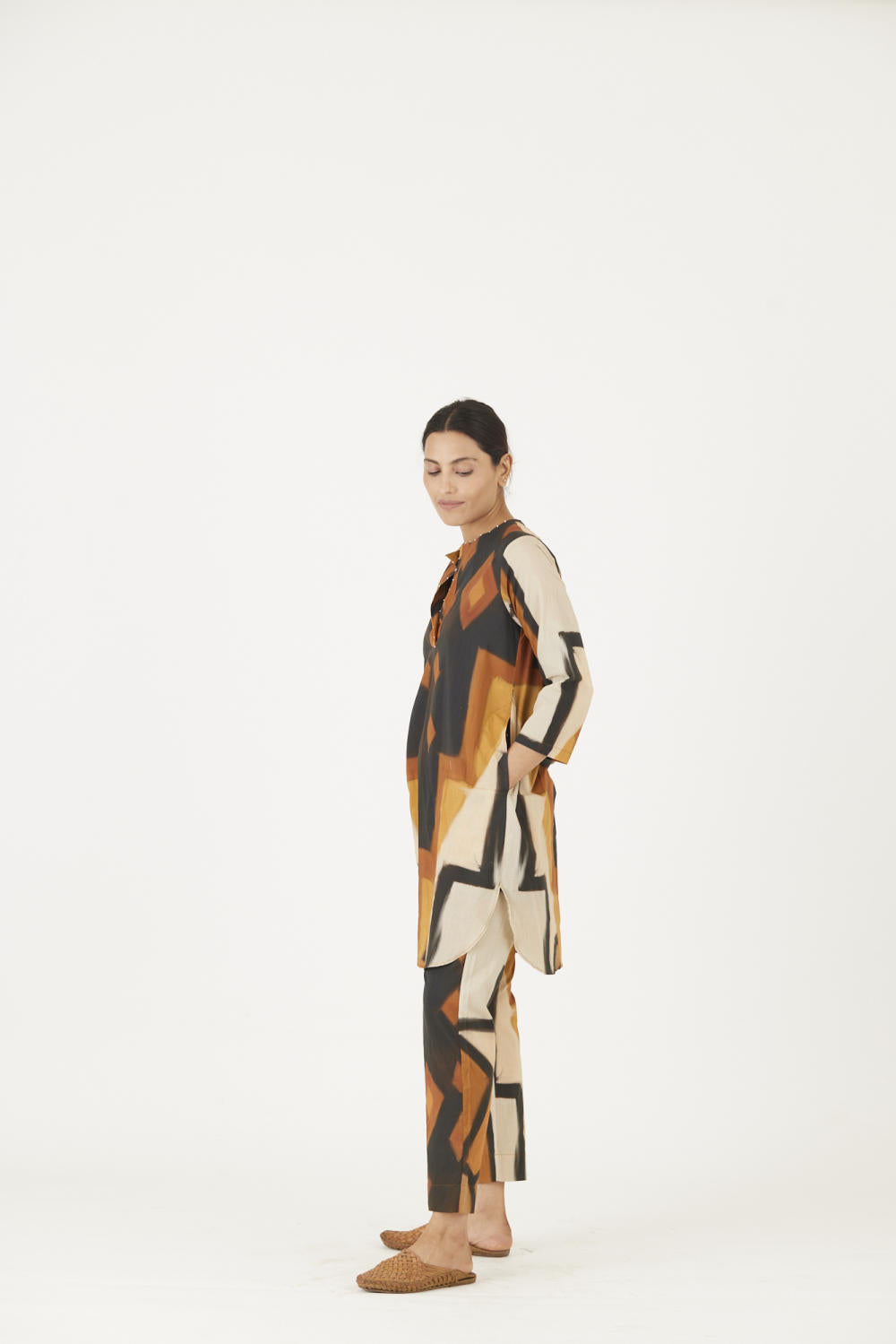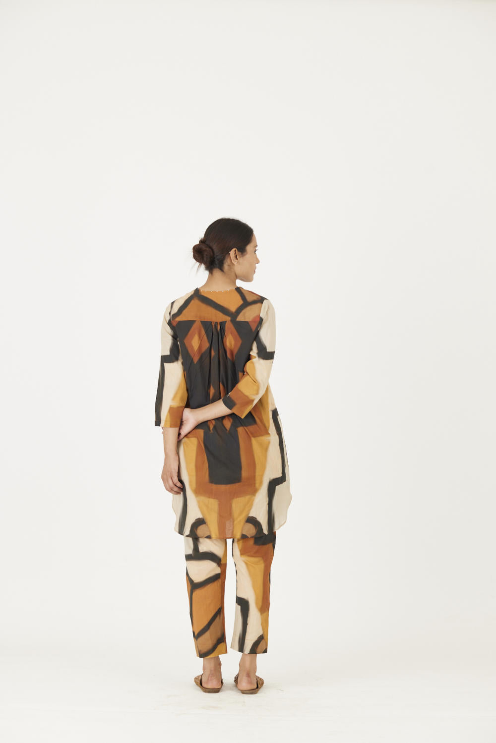 The print is inspired from the ancient rugs of Egypt and features a unique placement of florals and geomentric motifs . The set includes a short kurta with side slits and 2" kurta patti . It comes with complimenting pants.